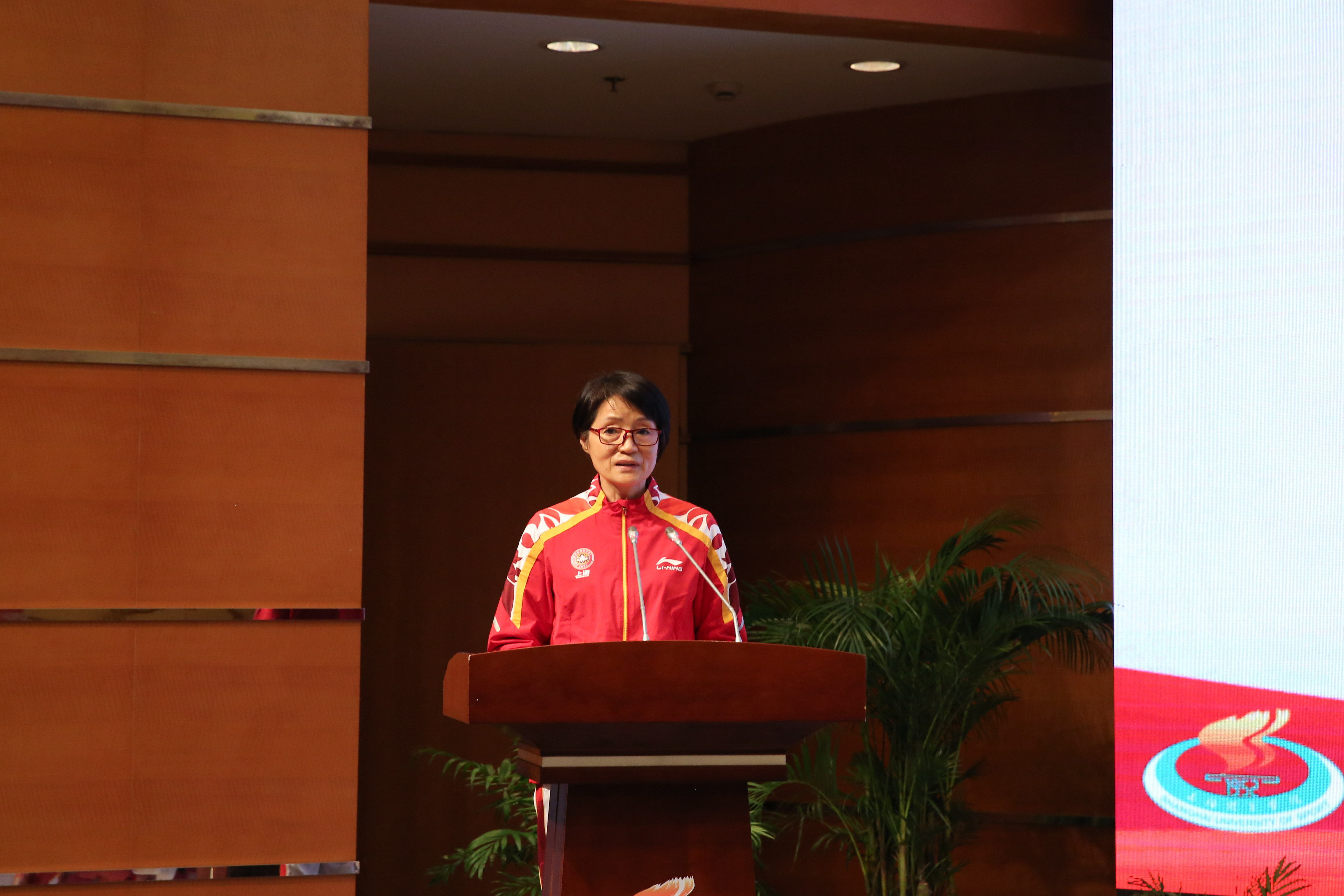 上海体育局党组书记、局长徐彬出席活动并讲话。徐彬对获得荣誉表彰的运动员、教练员和保障人员表示祝贺!向一直以来支持上海体育发展、为上海培养大批体育人才的一流学府上海体育学院表示感谢。徐彬局长从以体育人,欣欣向荣、追着未来出发,创新引领梦想两个方面阐述了什么是真正的“上体精神”以及肯定学校在科技助力体育方面做出的贡献。同时对学校提出了四点希望。一是希望体院运动员、教练员和保障人员,不骄不躁、再接再厉,全身心投入新一轮备战周期。二是希望上海体育学院更好发挥“双一流”科研创新优势,为上海体育创新发展提供助力。三是希望上海体育学院立足上海、服务全国,成为支持上海体育高质量发展的人才库和智慧脑。四是希望上海体育学院建好建强体育文化阵地,提升上海体育影响力,成为上海软实力“金名片”的重要组成部分。