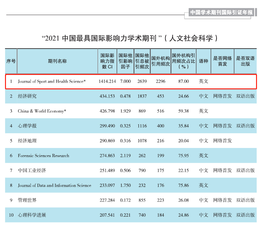 本网讯 12月6日,由中国期刊协会、中国科学技术期刊编辑学会、中国高校科技期刊研究会、全国高等学校文科学报研究会、《中国学术期刊(光盘版)》电子杂志社有限公司共同主办的“2021中国学术期刊未来论坛”开幕,会上发布了由中国知网和清华大学图书馆联合研制的《中国学术期刊国际引证年报》(2021版)(以下简称“年报”),并公布“2021中国最具国际影响力学术期刊”名单。《运动与健康科学(英文)》(Journal of Sport and Health Science, JSHS)连续7年在2300余种人文社会科学期刊中排名第一,并荣获“中国最具国际影响力学术期刊”称号。