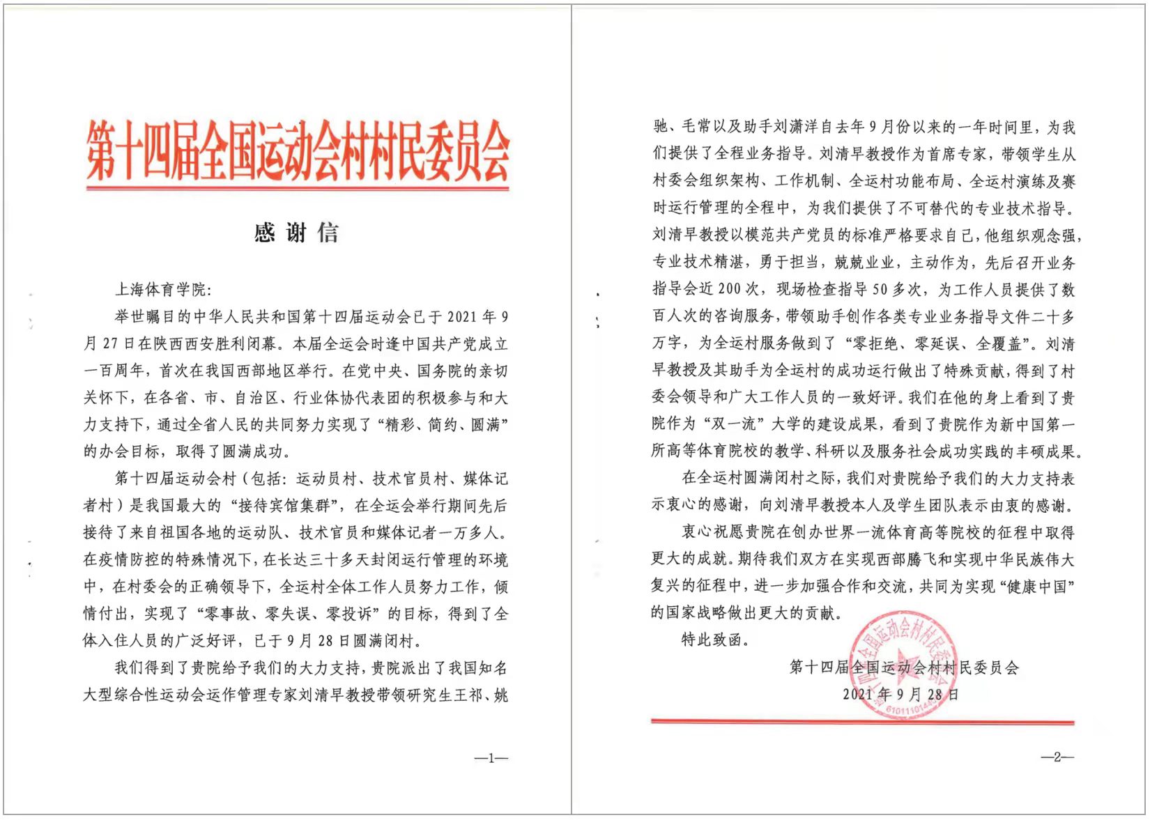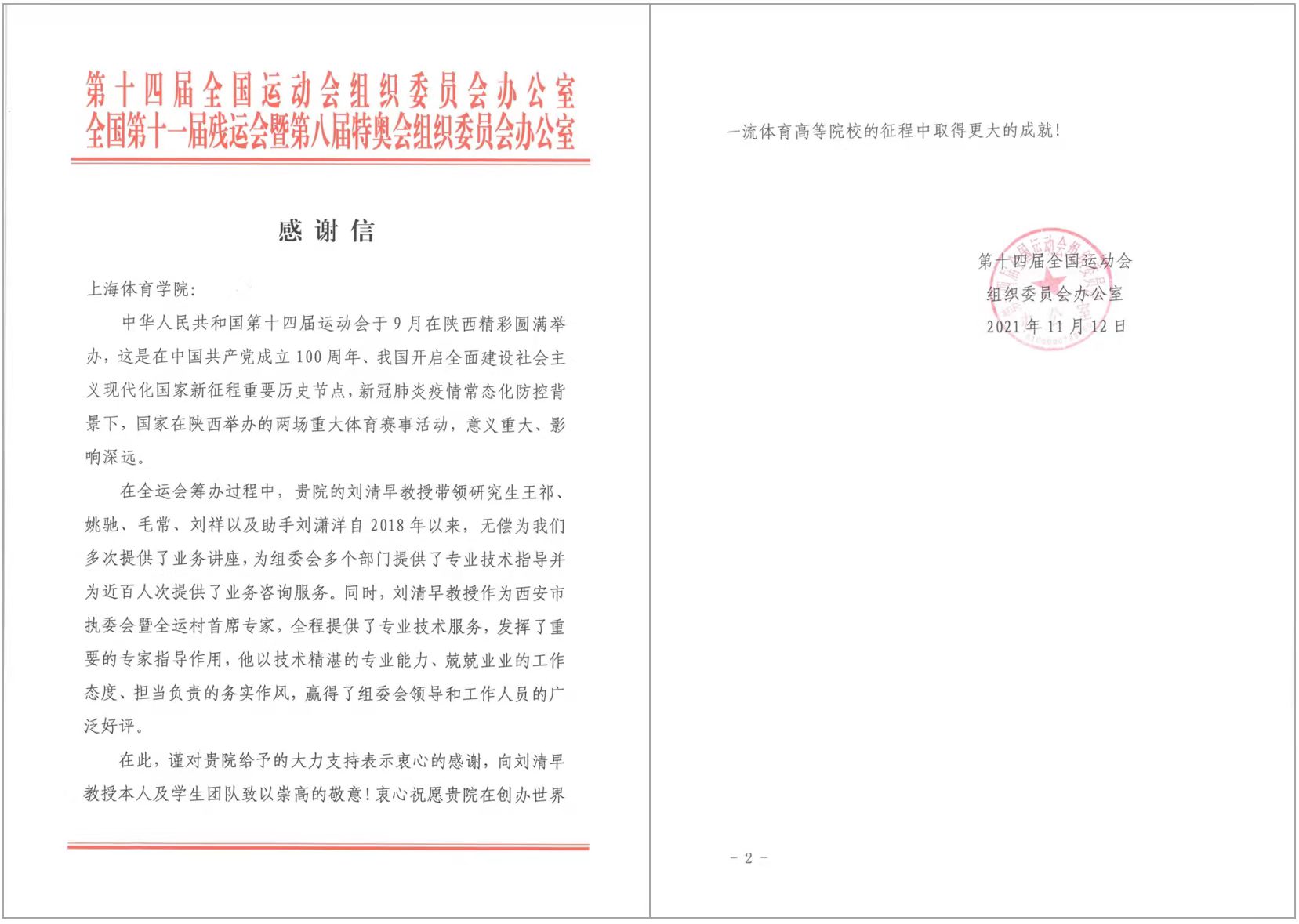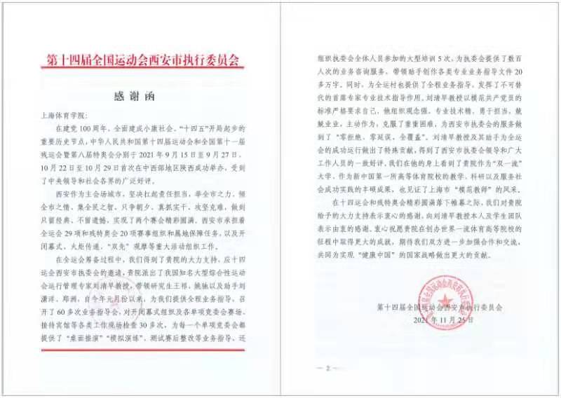 与此同时,第十四届全运会榆林市执委会也向我院发岀感谢函,感谢刘清早教授团队在陕西同时为榆林赛区提供了专家服务。
