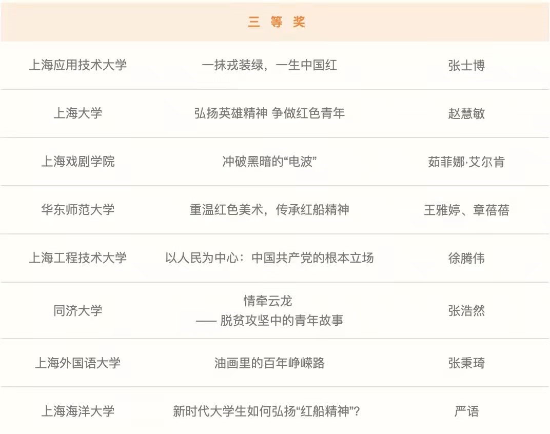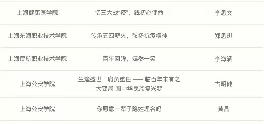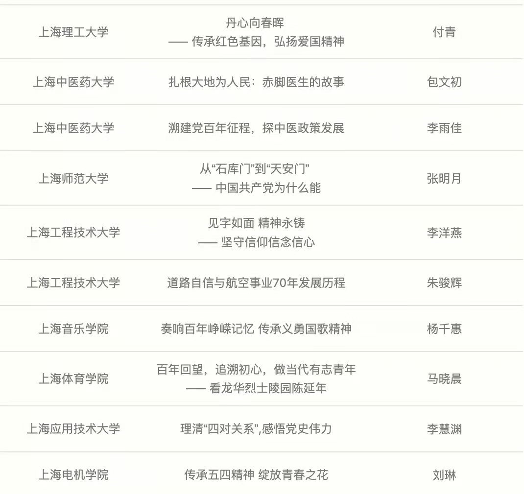 来自全市29所高校70余门优秀微课程作品围绕党史学习、弘扬伟大建党精神、脱贫攻坚、上海红色历史等主题,结合各校红色基因、专业特色等,并融合了演讲、音乐表演、舞蹈展示等丰富的形式,展现了上海青年学子对于党的历史的深入学习、深刻思考,并通过通俗易懂、喜闻乐见的形式转化为“飞入寻常百姓家”的理论宣讲课程。