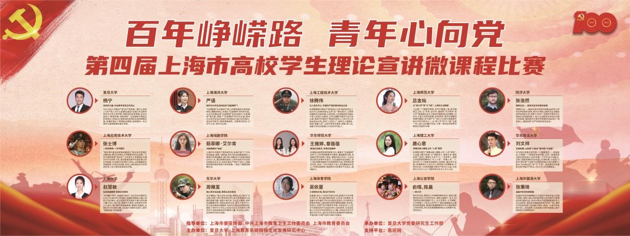 本网讯 习近平总书记指出,要加强传播手段和话语方式创新,让党的创新理论“飞入寻常百姓家”。回望第一个百年奋斗路,展望第二个百年新征程,在上海市委宣传部、上海市教育卫生工作党委和上海市教委的指导下,由复旦大学博士生讲师团承办的第四届上海市高校学生理论宣讲微课程大赛已圆满落下帷幕。