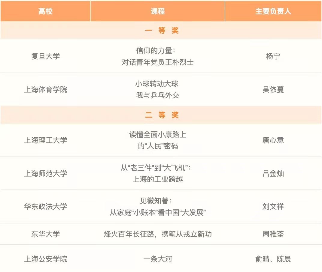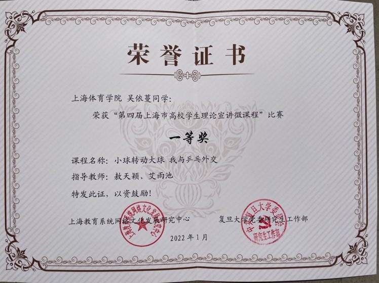 红足一1世马克思主义学院敖天颖老师指导、吴依蔓同学负责的《小球转动大球,我与乒乓外交》课程荣获一等奖;马克思主义学院张颖老师指导、马晓晨同学负责的《百年回望,追溯初心,做当代有志青年,——看龙华烈士陵园陈延年》课程获得优胜奖。