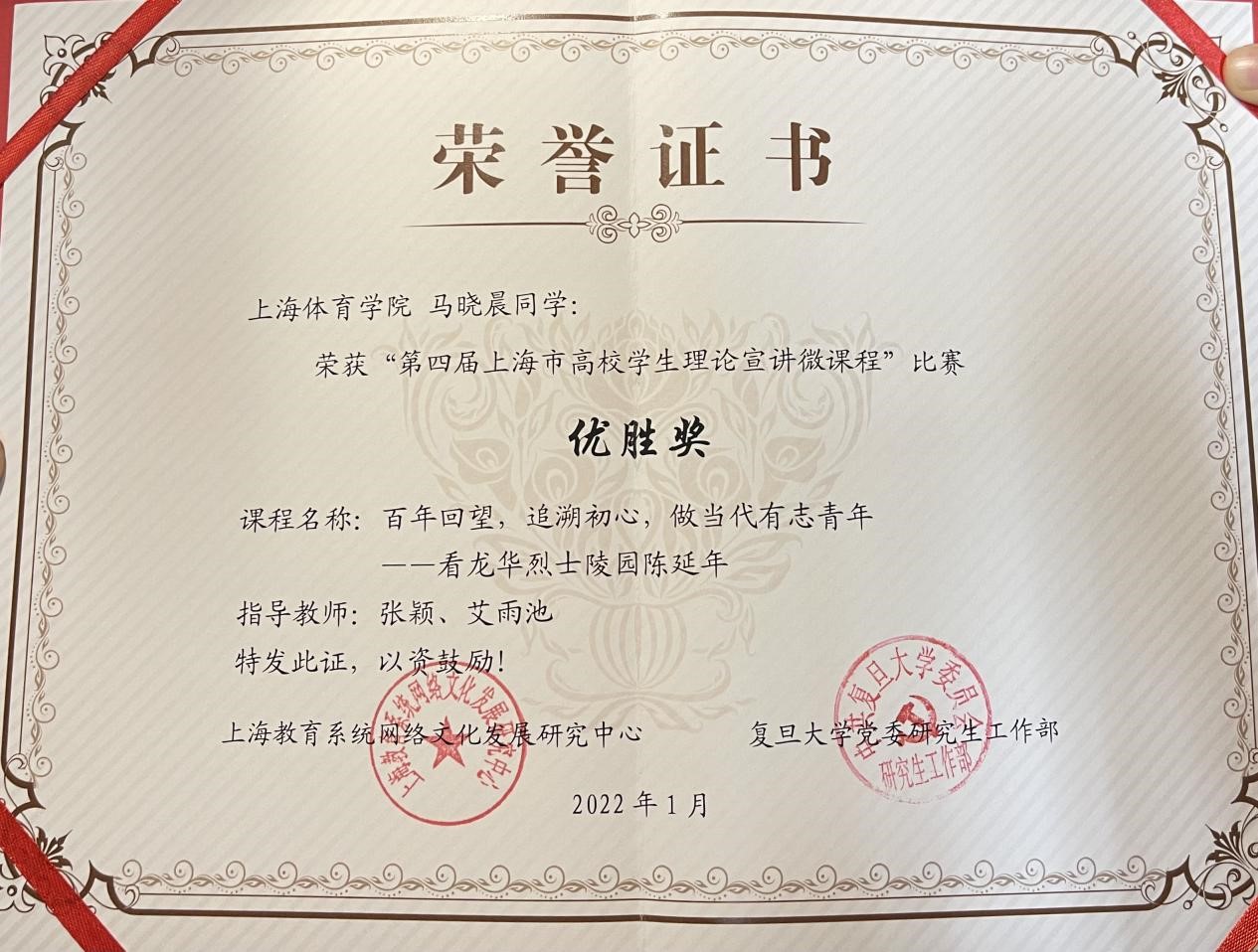 来自体育教育训练学院的马晓晨同学凭借《百年回望,追溯初心,做当代有志青年——看龙华烈士陵园陈延年》获得优胜奖。