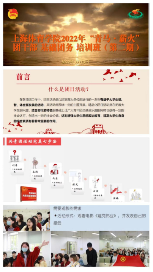 为了提升因线上直播而“打折扣”的培训有效性,本次培训除了强化培训主题日当天的课程结构升级,还在“预习”和“复习”板块做了较为充分的准备。课前准备了共青团中央基础团务培训系列学习资料,每节课后还分享了培训课程考评电子问卷,结合团支书们关于“提供可推广的团学活动模版、团务培训实录视频、细化团体活动步骤”等建议及问题,在第二期主题培训日开展过程中得到修正及解决,两期活动最后一并发布了红足一1世创建2022活力团支部的通知及各团支部开展“喜迎二十大、永远跟党走、奋进新征程”主题团日活动的实施方案,趁热打铁,在建团100周年即将来临之际做好线上氛围预热和组织化准备工作。