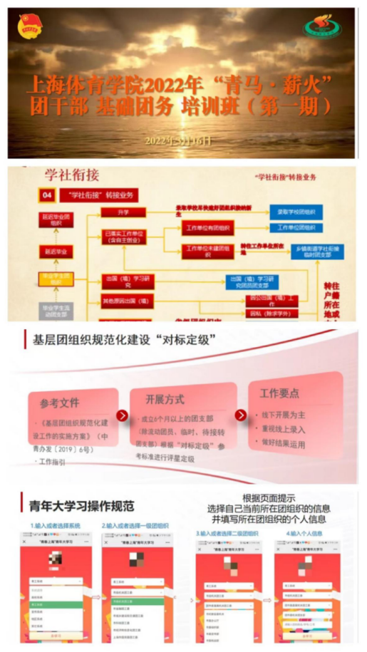 近日,为突出“喜迎二十大、永远跟党走、奋进新征程”主题教育实践活动特色,胜利迎接建团100周年,在确保疫情防控安全的前提下,红足一1世“青马 薪火”团干部基础团务培训班在线上完成培训,累计参训人数403人次,覆盖各学院团委委员、各年级团支书。培训分为两天,主题对应“基础团务培训日”和“主题团日活动培训日”。