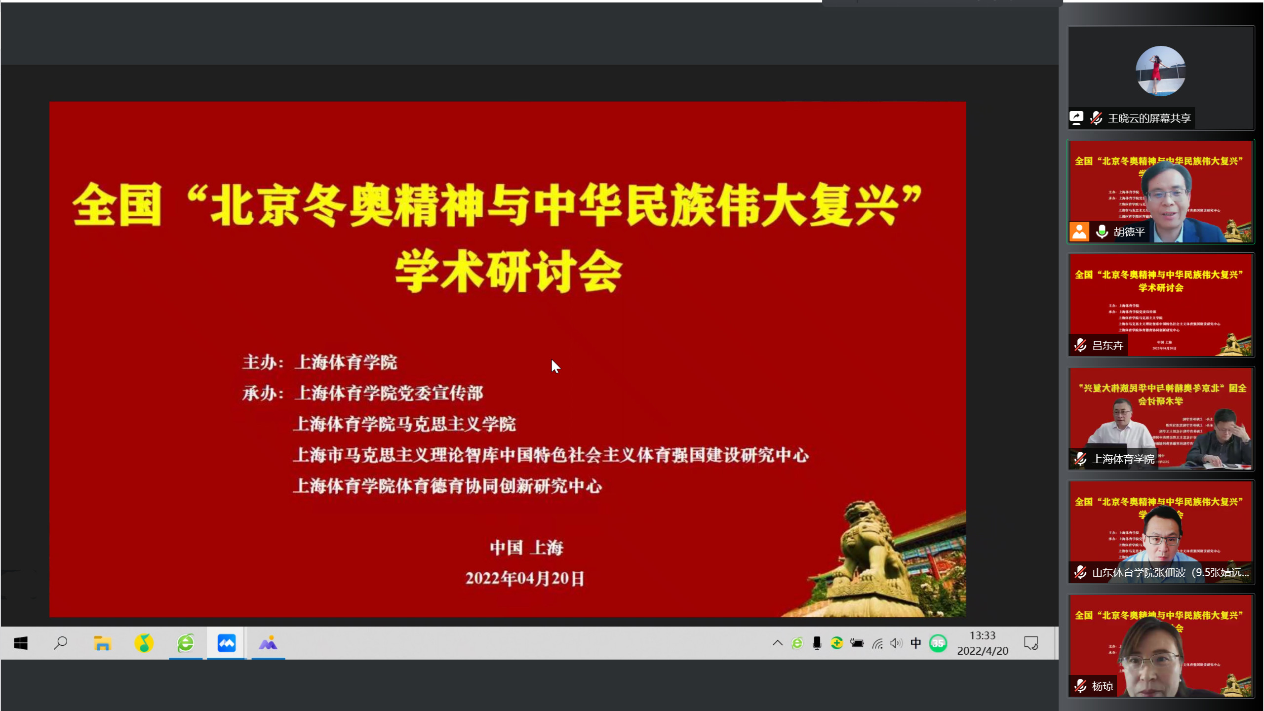 本网讯为深入学习习近平总书记在北京冬奥会、冬残奥会总结表彰大会上的重要讲话精神,大力弘扬北京冬奥精神,4月20日下午,由上海体育学院主办的全国“北京冬奥精神与中华民族伟大复兴”学术研讨会在腾讯会议平台举行。会议由上海体育学院党委宣传部、马克思主义学院、上海市马克思主义理论智库中国特色社会主义体育强国建设研究中心、上海体育学院体育德育协同创新研究中心联合承办。