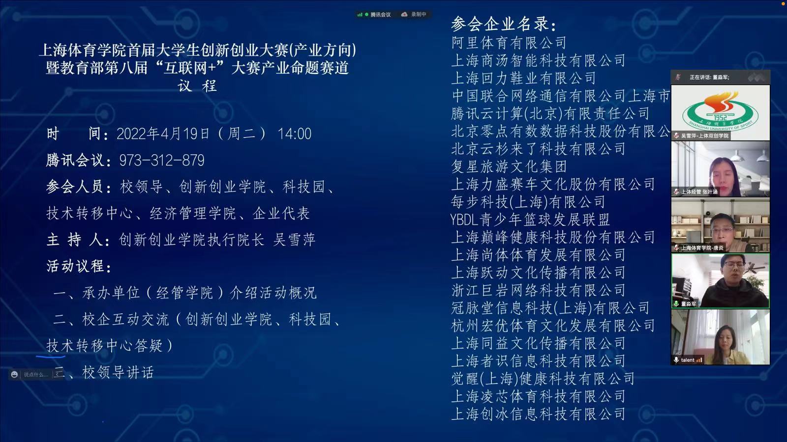 本网讯 上海体育学院首届大学生创新创业大赛(产业方向)暨教育部第八届“互联网+”大赛产业命题赛道线上宣讲会于2022年4月19日通过腾讯会议顺利举行。会议由上海体育学院创新创业学院执行院长吴雪萍主持,上海体育学院副院长唐炎,活动主办单位创新创业学院副院长陈伟、科技园总经理徐琳、技术转移中心主任董淼军,活动承办单位经济管理学院院长李海、党委书记游林生以及体育产业优秀公司代表等通过云端共赴盛会。