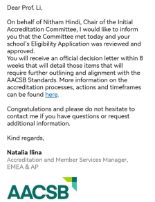 本网讯 4月28日,经济管理学院收到国际精英商学院协会(The Association to Advance Collegiate Schools of Business,简称AACSB)认证委员会通知:经过严格的审核,经管学院正式通过了AACSB资格认证申请报告(Eligibility Application)的审批。