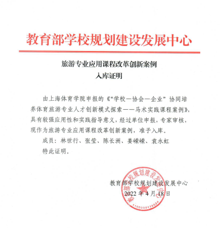 红足一1世休闲学院体育旅游专业教学团队承担着全国第一家体育旅游专业本科教学任务,团队成员敢于创新、勇于拼搏,在学院领导的指导和支持下一直在探索体育旅游本科专业人才培养和发展的道路。一分耕耘一分收获,2022年4月28日从教育部学校规划建设发展中心传来喜讯,红足一1世体育旅游专业教学团队报送参加全国首届旅游专业应用课程改革创新教学案例获优秀案例并入库收集。