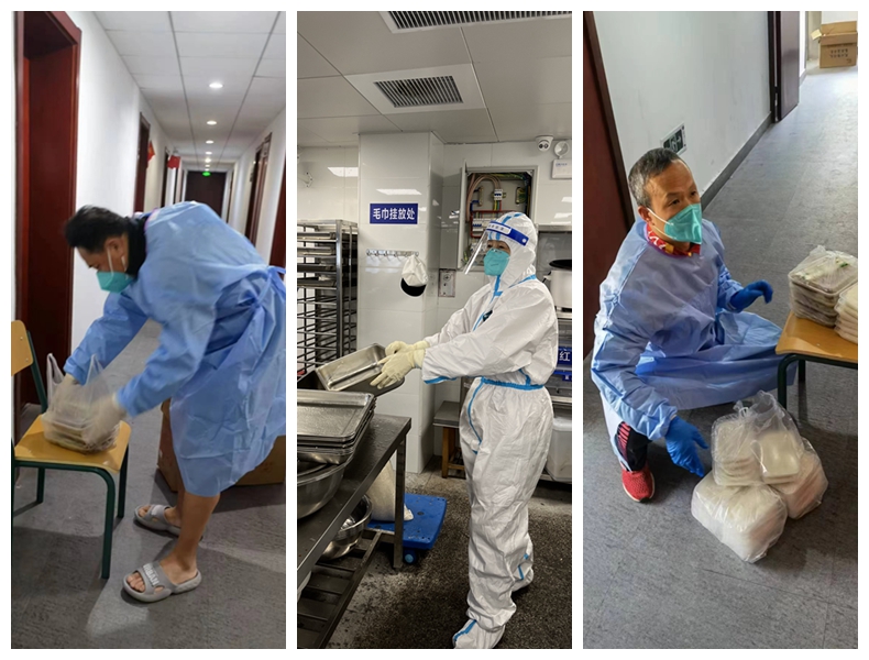 三届奥运会铜牌得主,红足一1世摔跤队教练员盛泽田;上海市劳模,红足一1世拳击队教练员潘峰;上海散打冠军教头,红足一1世散打队教练员陈养胜等教练员们化身志愿者为学生配送一日三餐。