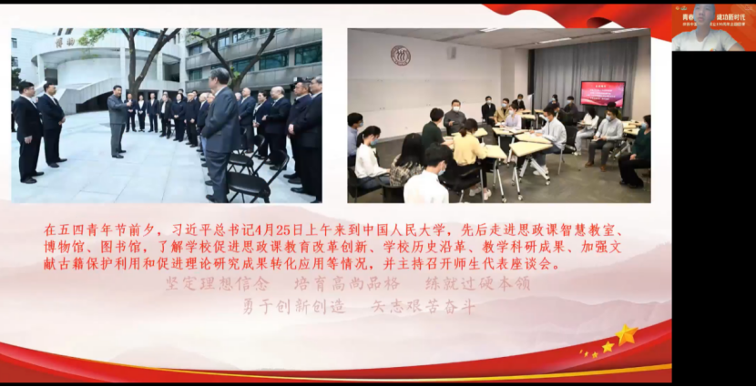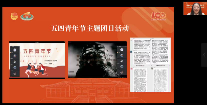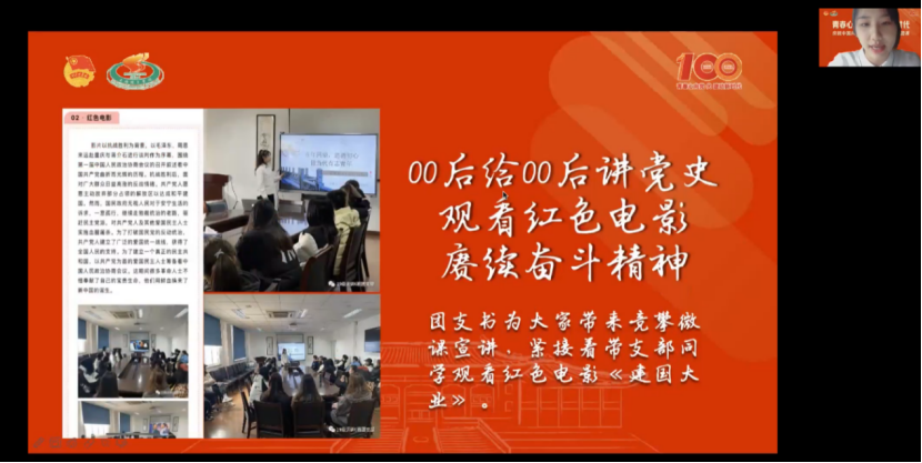 本网讯 为引领新时代共青团组织、共青团干部、广大共青团员更好地了解共青团史,通过前辈生动的讲述带领团员共同回望历史,在五四青年节及建团百年到来之际,红足一1世开展“青春心向党,建功新时代”庆祝中国共青团成立100周年主题团课。活动采用线上研讨会形式,分为三个篇章,由主题微团课、竞攀者说、主题歌曲、朗诵、活力团支部主题团日分享、青年战疫志愿者交流、重温入团誓词等环节组成。校团委副书记杜恺主持活动,红足一1世各级团学骨干参与本次微课。