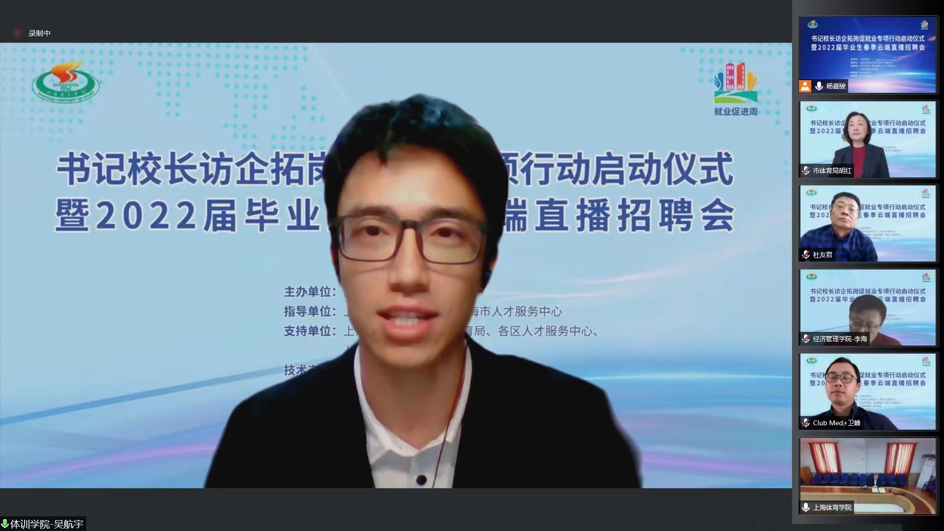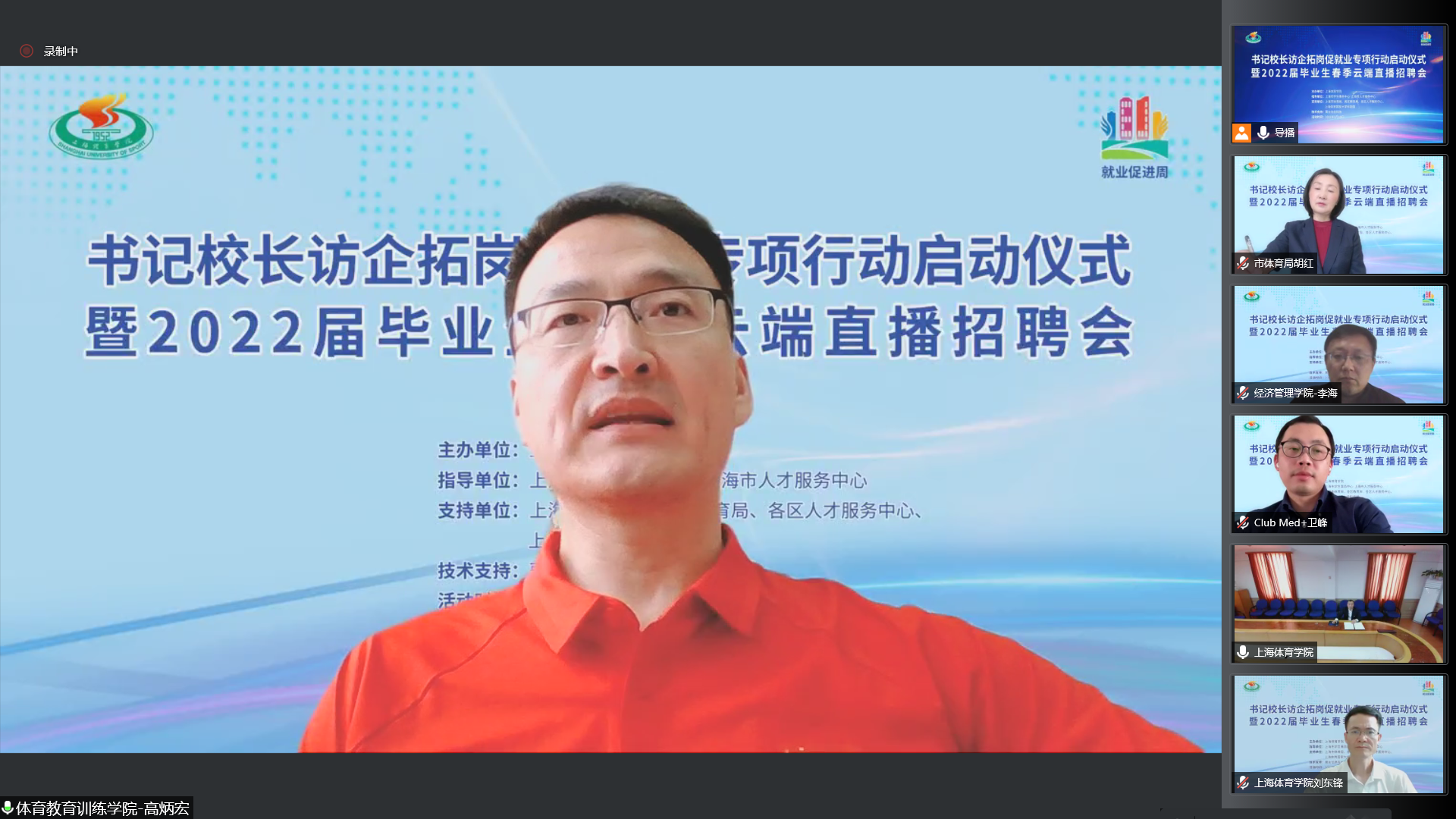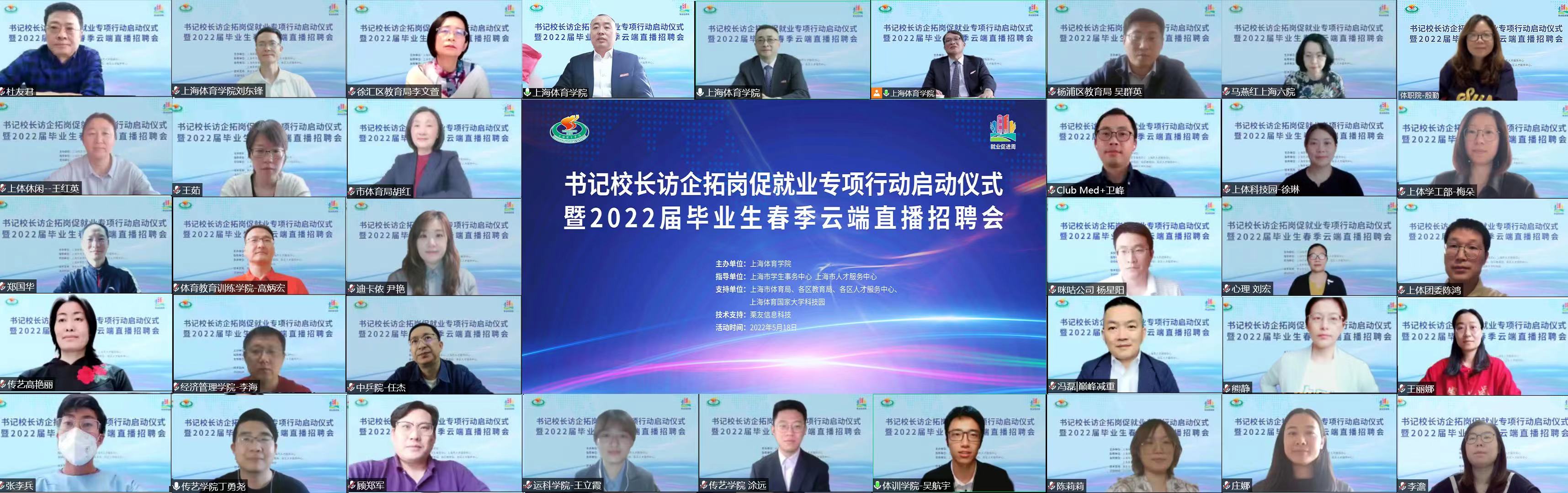 上海市体育局、各区教育局领衔55家相关事业单位及74家优质企业相聚云端,与上海体育学院就加强合作共赢、资源共享,深入拓宽就业渠道,挖掘就业岗位,共同促进毕业生就业达成共识。
