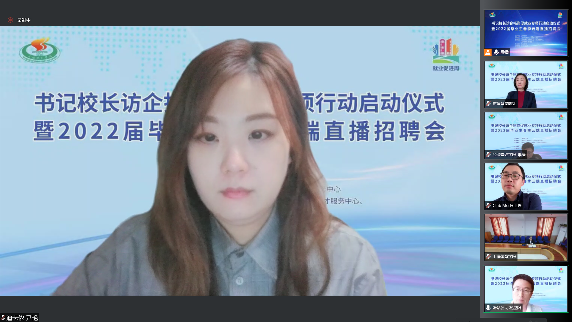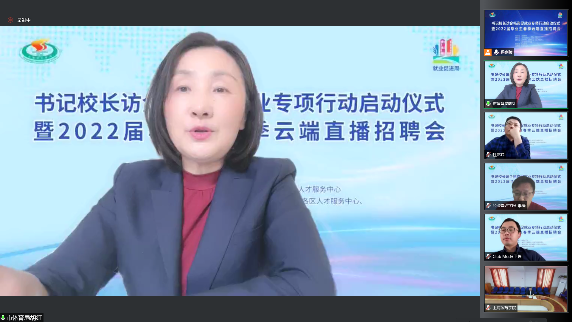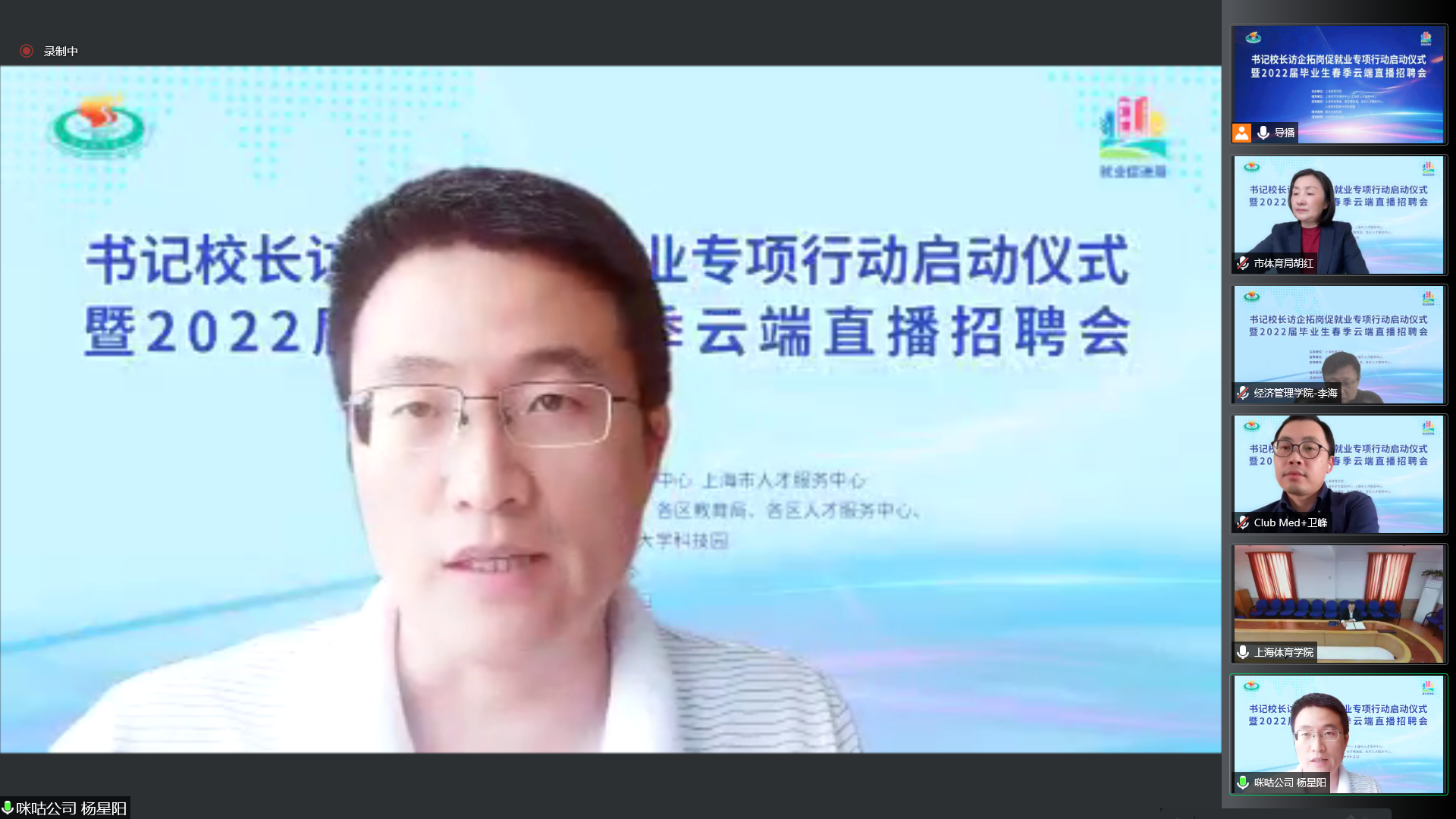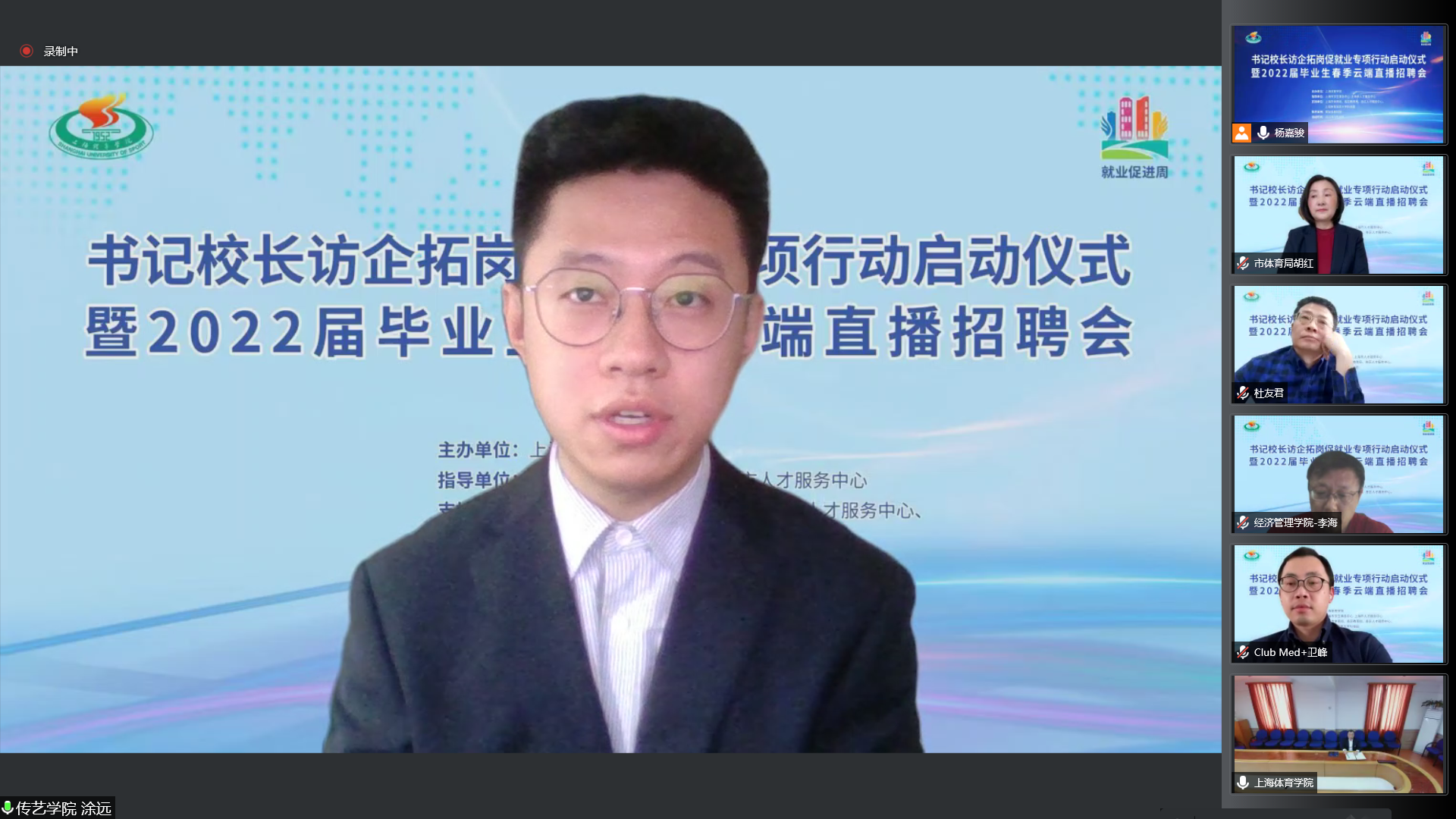上海市体育局、各区教育局领衔55家相关事业单位及74家优质企业相聚云端,与上海体育学院就加强合作共赢、资源共享,深入拓宽就业渠道,挖掘就业岗位,共同促进毕业生就业达成共识。