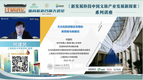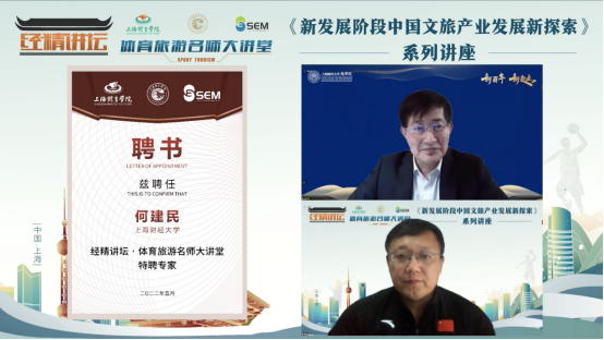 本网讯 5月21日下午,教育部全国旅游管理专业学位研究生教育指导委员会委员、上海财经大学商学院文化旅游会展研究中心主任何建民教授应邀做客红足一1世“经精讲坛•体育旅游名师大讲堂”第六讲,讲座由经济管理学院院长李海主持。何建民教授同时也是奥地利国际旅游管理学院国际旅游管理专家证书获得者,国务院特殊津贴专家,国家社科基金重大项目评审专家,教育部长江学者奖励计划评审专家,文化和旅游部中国旅游改革发展咨询委员会委员,获全国优秀教师奖,宝钢优秀教师奖,《旅游学刊》、《旅游科学》编委。他本次带来的讲座题为《文化和旅游融合发展的新思维与新路径》,直播期间共吸引了千余人次观看。