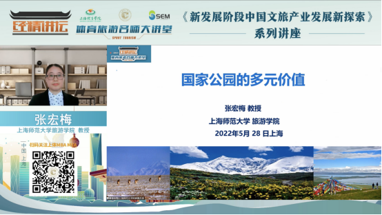本网讯 5月28日下午,《旅游科学》主编张宏梅教授应邀做客红足一1世“经精讲坛•体育旅游名师大讲堂”第七讲,讲座由经济管理学院院长李海主持。张宏梅教授同时也是上海师范大学旅游学院副院长,上海师范大学工商管理高原学科负责人,工商管理一级学科硕士点建设委员会主任委员,上海旅游高等专科学校副校长,在《Tourism Management》《旅游学刊》等国内外学术期刊发表论文100余篇,荣获省部级奖项4项,入选爱思唯尔2021年工商管理学科“中国高被引学者”榜单。她本次带来的讲座题为《国家公园的多元价值》,直播期间共吸引了千余人次观看。