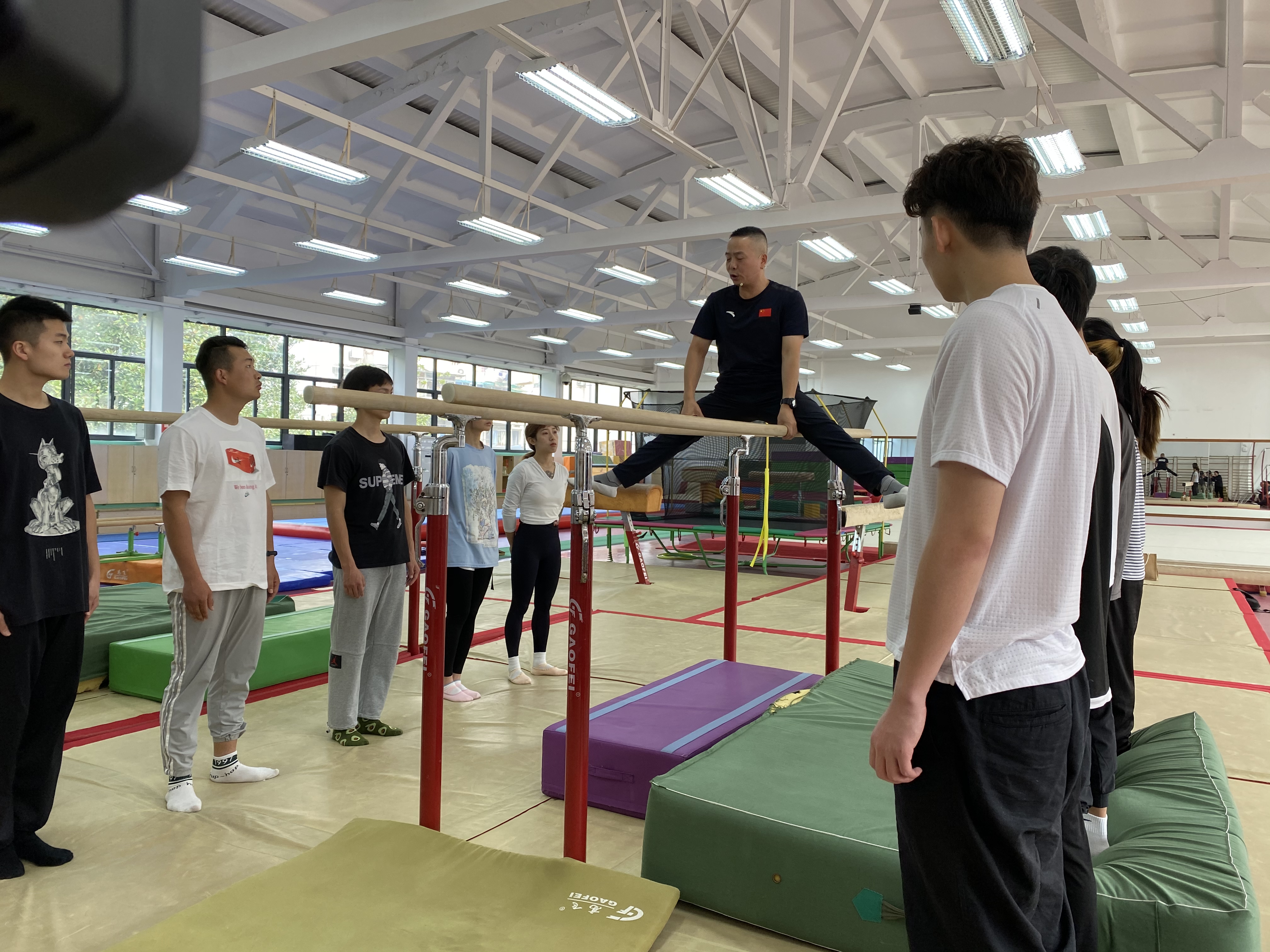 在45分钟的教学展示中,高希彬老师围绕教“掌握双杠前滚翻成分腿坐技术动作要领”教学目标进行课堂教学,通过分组练习,同伴互助、组织游戏等多种教学手段,由易入难、循序渐进、分层分类实施教学内容,稳步扎实推进教学进程。在课程思政方面,课前以体操奥运冠军故事为导入培养学生爱国主义情怀;课中以分组训练成员间相互保护为契机,提高学生团队意识;课后以身体素质训练为手段锻炼学生坚持到底,永不放弃的意志品质。