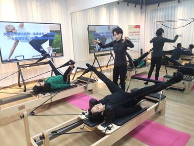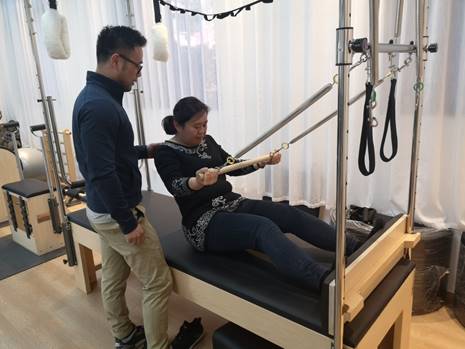 训练环节,女教授们在陆文骏教练,以及休闲学院陆莉萍副教授、杨乔博老师的一对一的指导下,从最基本的拉伸开始,通过器械练习,感受普拉提的魅力。其中的三组活动,老师们都交替进行体验。reformer核心床,通过滑床、弹簧、踏板、带子等设备帮助运动者进行练习,引导运动者的身体在正确的轨道上平面运动;tarpeze table秋千架,通过身体的上下卷动,放松脊柱;ladderbarrel梯桶,根据梯桶的弧度,运动者通过站姿、悬挂、攀爬、倒立等动作伸展脊柱。