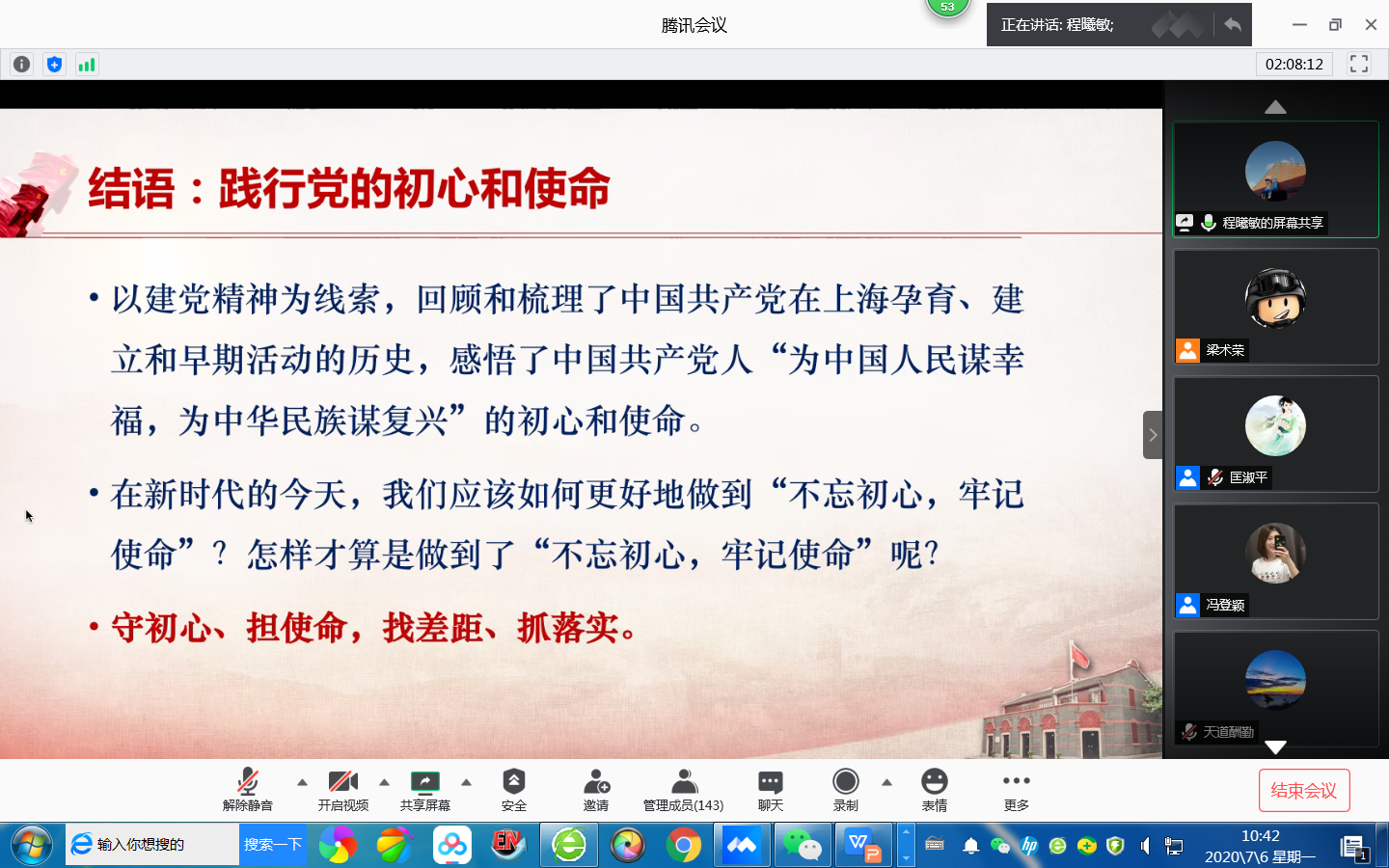 程曦敏老师也是上海市习近平新时代中国特色社会主义思想研究中心研究员,华东师范大学历史学博士。报告伊始,程曦敏老师阐述了学习党史,让初心薪火相传,把使命永担在肩的重要性和必要性。接着,以建党精神为线索,回顾和梳理了中国共产党在上海孕育、建立和早期活动的历史,探寻了中国革命的精神源头。一是开天辟地敢为人先,逐步确立初心使命,回顾了中国共产党初心和使命的孕育过程,展现了早期的中国共产党人开天辟地敢为人先的雄伟气魄;二是坚定理想百折不挠,为初心使命而奋斗,再现了早期的中国共产党人在上海开展活动的重重困难;三是立党为公忠诚为民,为初心使命而奉献,展现了中国共产党人始终坚持以人民为中心的实践自觉。最后,程曦敏老师指出,新时代我们要深入学习贯彻习近平新时代中国特色社会主义思想,将其转化为推进改革发展稳定和党的建设各项工作的实际行动;对照初心使命,将其内化为锐意进取、开拓创新的精气神和埋头苦干、真抓实干的自觉行动,为中华民族伟大复兴,为上海改革开放再出发,做出自己新的贡献。程老师讲述内容丰富,史料引用详实,以故事讲述的方式深入浅出、通俗易懂地讲解,参与学习的老师都反馈受益匪浅。老师们也纷纷表示,要做到不忘历史、不忘初心,知史爱党、知史爱国,永葆坚定信念、永葆奋斗精神,助力学校的“双一流”和上海地方高水平大学建设。