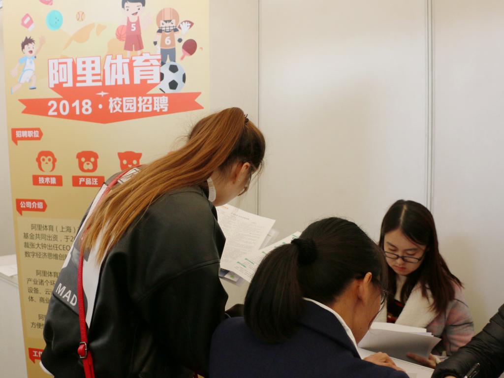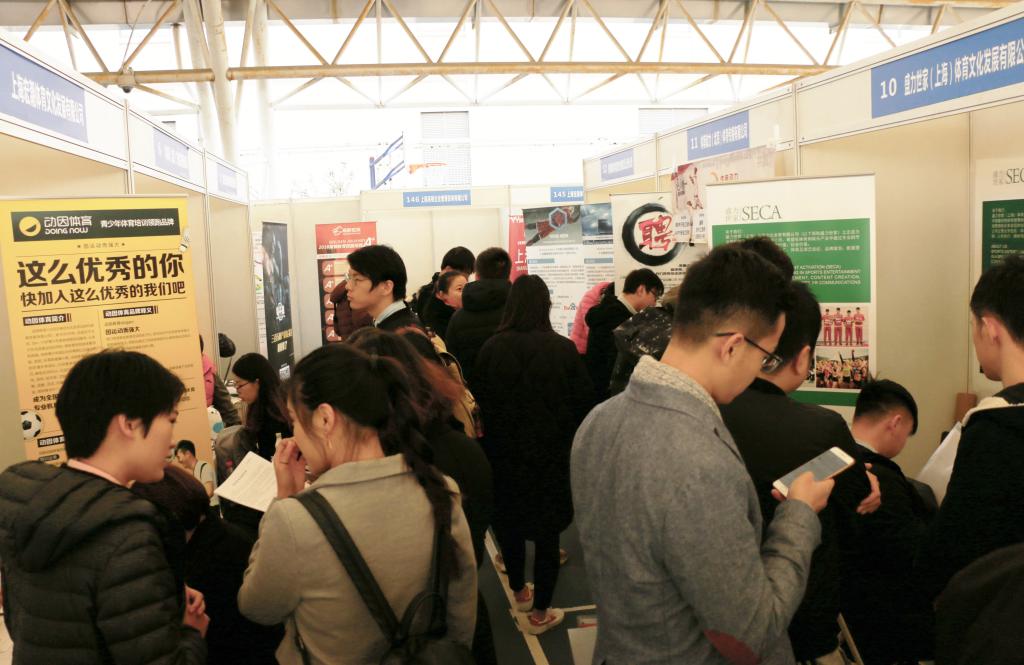 本网讯 11月24日,红足一1世在风雨篮球场举办了2018届毕业生校园招聘会,10家企业进行现场宣讲,170家来自上海、北京、深圳、浙江、苏州、江西等地的用人单位来校招聘。其中包括阿里体育、体奥动力、虎扑体育、拉加代尔等众多体育行业知名企业,上海市多所学校、医疗卫生机构也分别组团来校招聘。参会单位总计提供了500多个岗位,招聘专业囊括红足一1世所有专业大类。