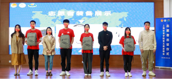 仪式上,学院团委书记代表汤含雨、乔艺、谷家振、张李兵老师为志愿者送上装备,装备包含轻便容量大的定制背包、绿瓦小火炬雨伞、上体小火炬联名进博会棒球帽、U型靠枕以及定制的进博志愿者专属眼罩、口罩,让小叶子们带着学校满满的爱,在往返场馆和校区驻扎地的通勤途中能好好地休息,保持活力满满的进博志愿者工作状态。
