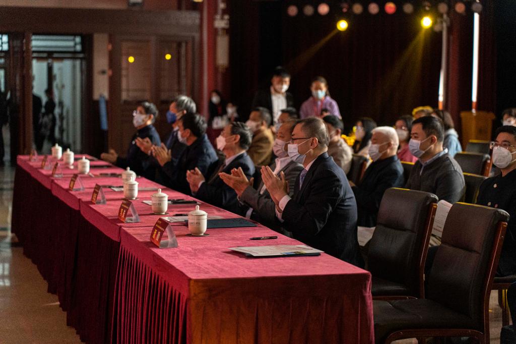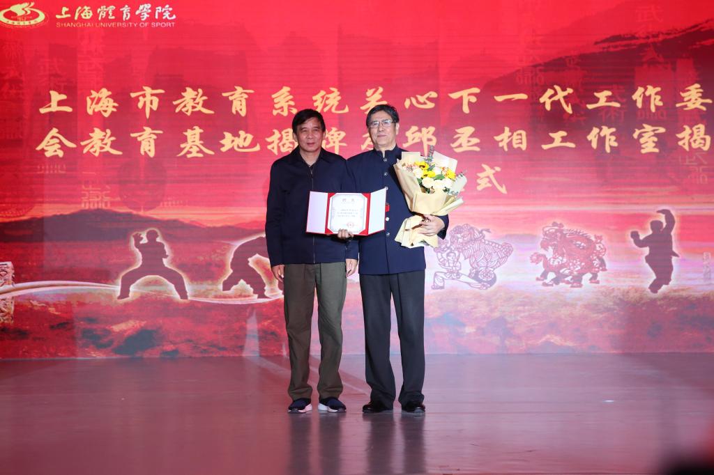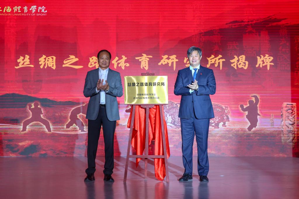 赵光圣和孙麒麟为中国体育科学学会武术与民族传统体育分会丝绸之路体育研究所揭牌,祝莉为李重申教授颁授名誉所长聘书;