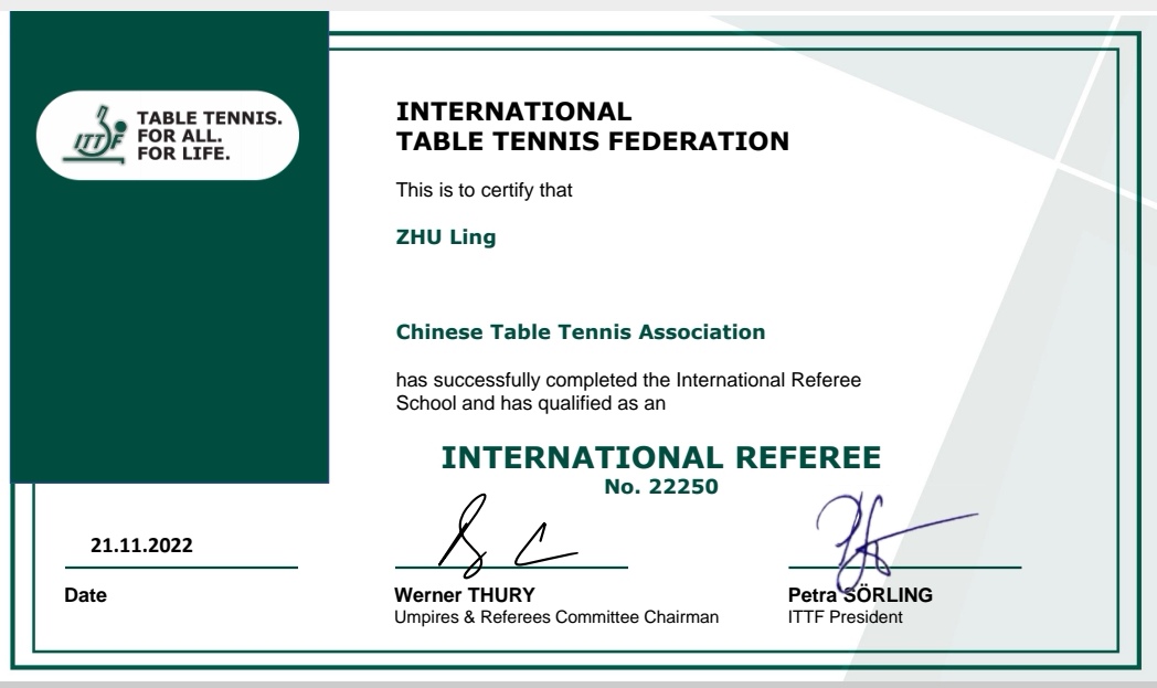 根据2022年10月国际乒联官网的最新国际裁判长名单,中国乒协目前共有7名乒乓球领域的国际裁判长。国际乒联在裁判等级晋升方面拥有非常完善、严格的制度,只有国际乒联认证的国际级裁判长才有资格在国际正式比赛中担任裁判长。根据国际乒联裁委会的规定的资格条款,各国乒协根据国际乒联裁委会规定的资格条款对国内的裁判员中进行选拔,提名到国际乒联,再由国际乒联进行筛选,最终全球共有11名国际级裁判员获准参加2022年国际裁判长培训班。中国乒乓球协会在全国范围内选拔推荐了3人参加本次国际裁判长培训,朱玲顺利通过考核且当场颁发了国际级裁判长证书。