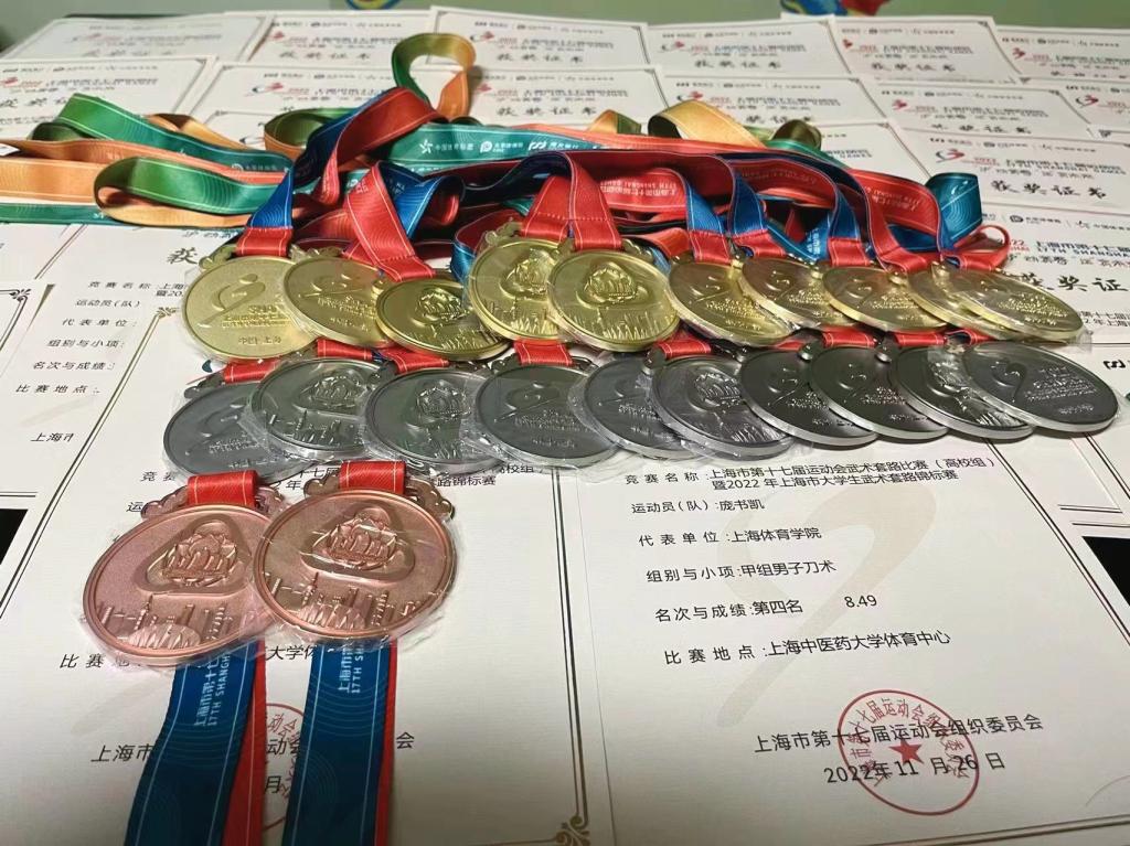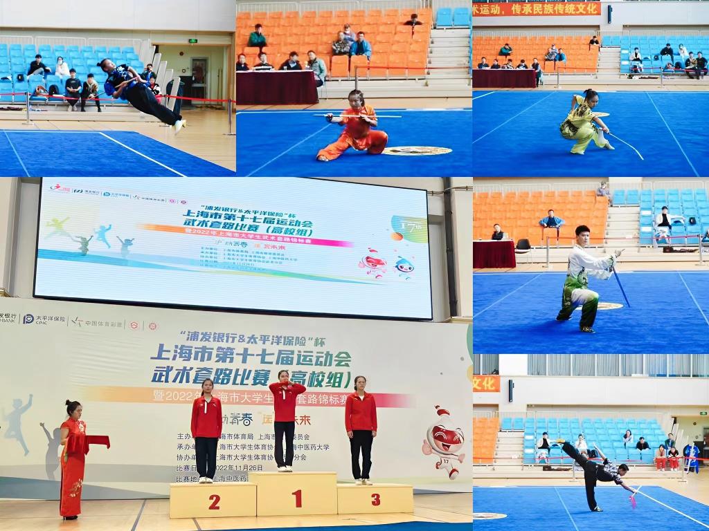 本网讯 2022年11月26日,上海市第十七届运动会武术套路比赛(高校组)暨上海市大学生武术套路锦标赛在上海中医药大学成功举办,来自复旦大学、上海交通大学、同济大学等17所沪上高校的102名武术精英以武会友、切磋交流,上海体育学院以10金10银2铜的优异成绩,夺得乙组金牌榜第一名、奖牌榜第一名。