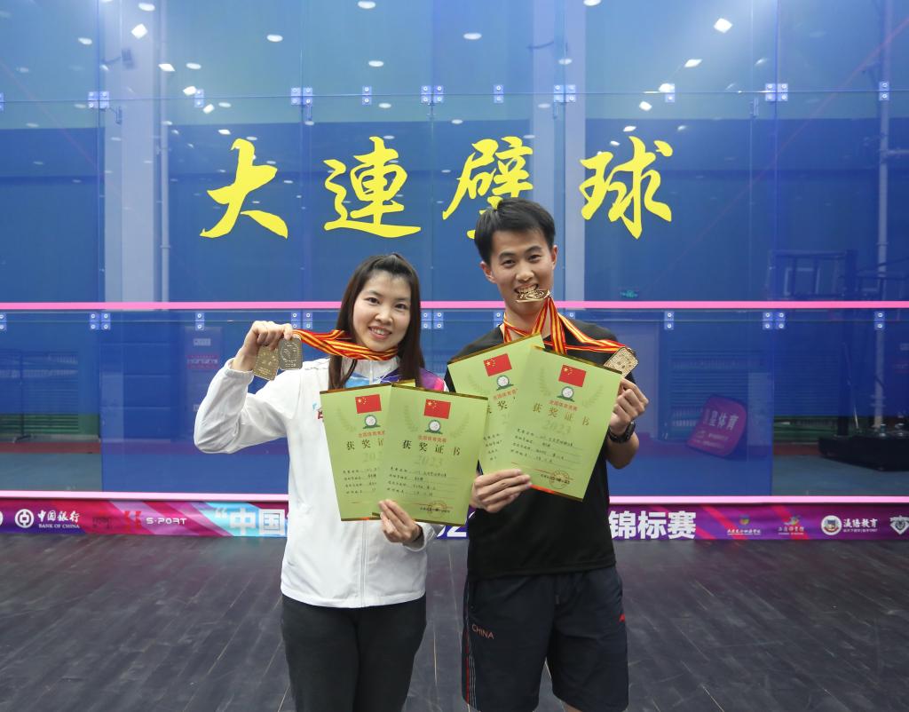 本网讯 3月25日-26日,“中国银行杯”2023年全国壁球锦标赛在大连举行,体育教育学院邵春老师、蒋健老师、李东锦老师(教练员兼运动员)率队参加了本次赛事,并包揽了本次比赛的甲组单项和混双冠军。