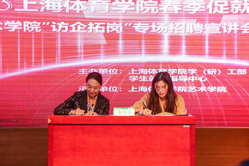 本次招聘会上海体育学院艺术学院与巅峰减重、上海纳纳科技有限公司、北京锋铄体育科技有限公司等3家代表企业签约共建教育实习实践就业基地。上海体育学院艺术学院副院长(主持工作)韩春英与企业负责人签署协议。