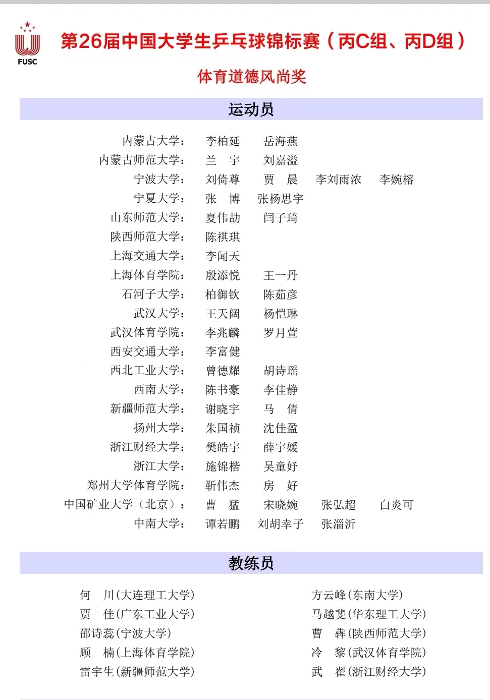 中乒院学子代表上海体育学院出战,顾楠、张琴两位中乒院老师带领男、女队员参赛。比赛中我院学子不畏强敌、敢打敢拼、斗志昂扬、奋力拼搏,不仅打出了极高的竞技水准,而且展现了蓬勃向上的精神风貌,取得了女子团体第三名、男子团体第五名等一系列好成绩。同时,我院参赛运动员殷添悦、王一丹荣获体育道德风尚奖,教练员顾楠荣获体育道德风尚奖。