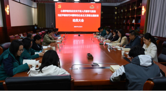 本网讯 4月23日下午,心理学院党总支关于深入开展学习贯彻习近平新时代中国特色社会主义思想主题教育工作动员大会在绿瓦大楼第四会议室召开。校主题教育指导小组督察指导组成员刘宏老师出席会议。心理学院党政班子,全体支部委员、师生党员代表参加了本次会议。会议由学院党总支副书记盛立恒主持。