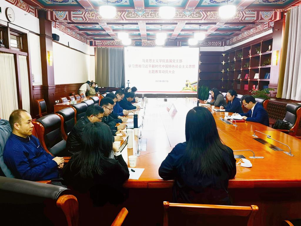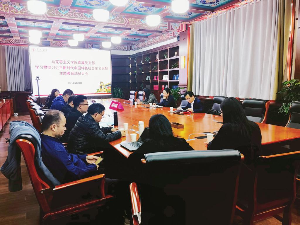 本网讯 4月27日上午,马克思主义学院直属党支部学习贯彻习近平新时代中国特色社会主义思想主题教育工作动员大会在绿瓦大楼第四会议室召开。校主题教育指导小组督察指导组成员刘宏同志出席会议并作指导讲话,马克思主义学院直属党支部书记、院长、主题教育领导小组组长胡德平同志作动员部署。学院全体党员教师参加会议。会议由学院直属党支部副书记、副院长马焕主持。