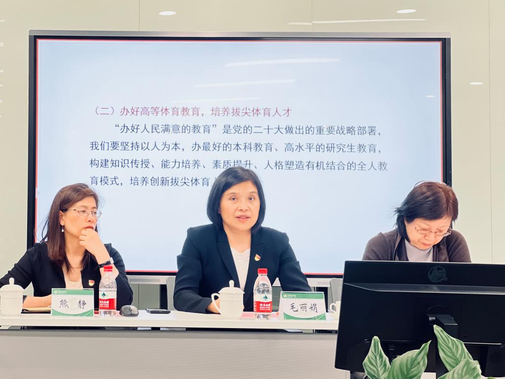本网讯 5月18日,上海体育学院党委副书记、院长毛丽娟赴运动健康学院江湾教学点,为运动健康学院和兴奋剂检测中心党员教师代表带来了题为“铸魂·增智·正风·促干——深学细悟党的二十大精神”的专题党课。此次专题党课是运动健康学院深入开展学习贯彻习近平新时代中国特色社会主义思想主题教育的重要一环,学院全体党员师生高度重视,共计50余名学院领导干部和党员师生参加了此次党课,本次党课由运动健康学院党委书记熊静主持,主题教育市委巡回第十七指导组副组长杨若凡,市主题教育办公室王军峰、上海体育学院党委组织部长张盛、副部长蒋啸天等列席。