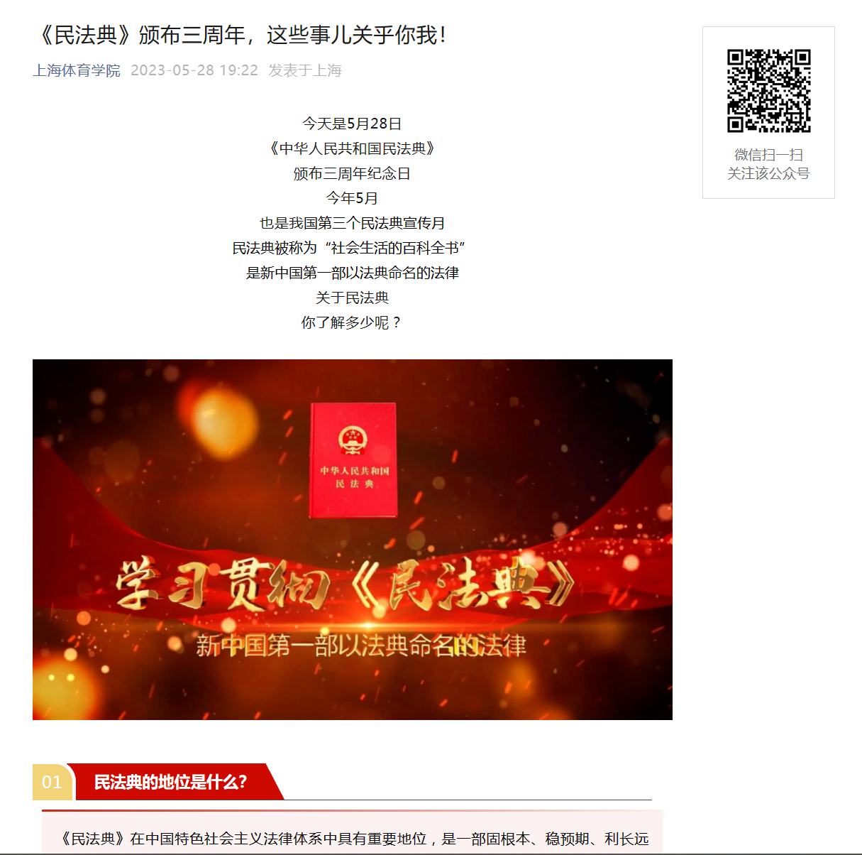 宣传月期间,学校采取多种形式开展“民法典进校园”活动,综合运用传统宣传媒介和新媒体平台,通过校内宣传电子屏、学校官网滚动图片等渠道投放“美好青春,民法典相伴”主题标语;在《民法典》颁布三周年纪念日当天,通过学校官方微信公众号推送《民法典》知识宣传文章等。下一步,学校将持续开展宣传,营造浓厚的学法氛围,进一步增强师生员工的法治观念,提高广大师生遇事找法、办事依法的意识和能力,为学校高质量发展营造良好法治环境、提供法治保障。