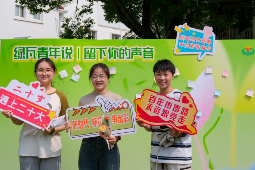 而在“青年大学习”专题摊位,则设置了“肆意青年说|留下一个声音”、“二十大精神我来传承”、“一人一笔激励绘画青年大吉祥物”等打卡内容,强化了绿瓦学子红心向党的决心,并留下自己对党和国家的美好祝福。