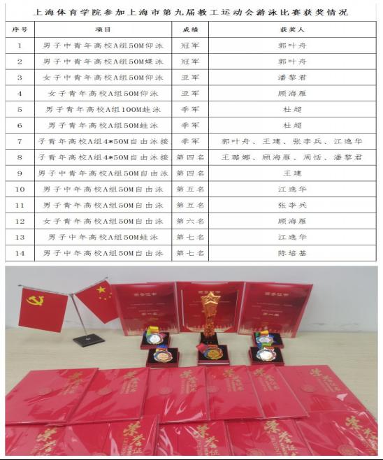 本网讯 6月3日,由上海市教卫工作党委、市教委、市教育工会主办的上海市第九届教工运动会游泳比赛在东方体育中心盛大举行。在工会的组织保障下,竞技运动学院和游泳协会派出16名教师,征战男、女4*50M自由泳接力和18个单人项目,取得高校A组团体总分第三的佳绩。