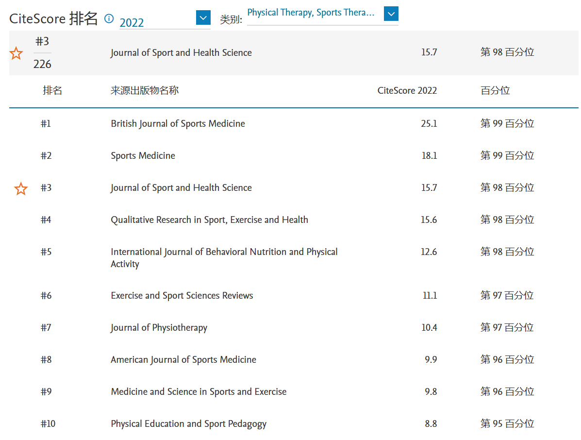 JSHS在物理治疗、运动疗法、康复(Health Professions: Physical Therapy, Sports Therapy and Rehabilitation)学科收录的226种期刊中排名第3(3/226),进入前2%(去年为3/218,前2%)。