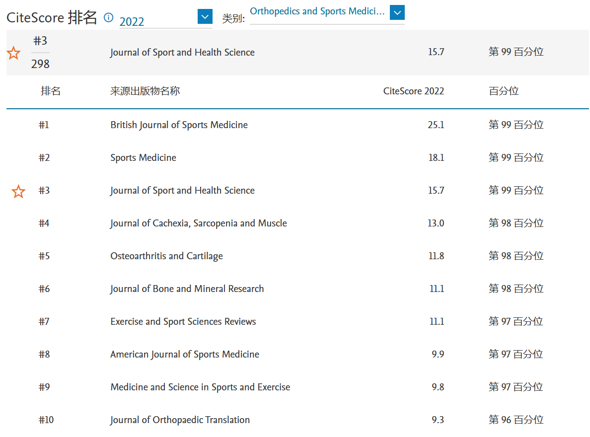 JSHS在骨科、运动医学(Medicine: Orthopedics and Sports Medicine)学科收录的298种期刊中排名第3(3/298),进入前1%(去年为5/285,前2%)。