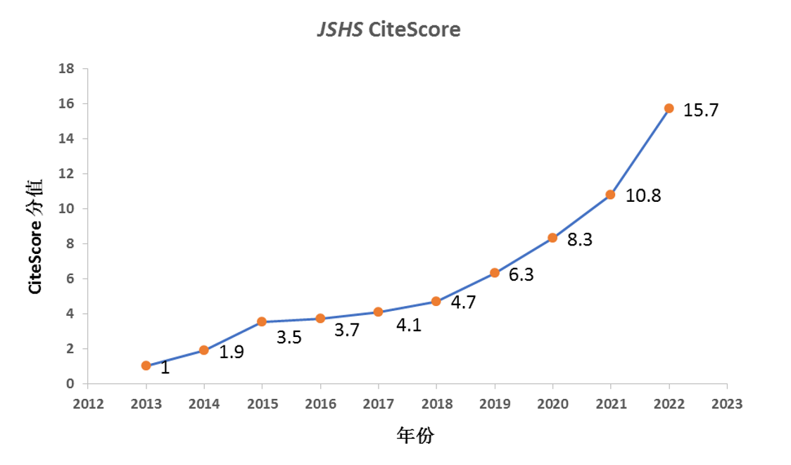 JSHS创刊于2012年,2014年被Scopus收录并获得首个CiteScore分值1。2023年,JSHS进入第二个发展十年,CiteScore分值超过15。JSHS的进步离不开校党政领导的高度重视,相关职能部门的协助配合,国际编委会的鼎力支持以及广大作者、读者和审稿人等的帮助扶持。展望未来,JSHS 将继续助力世界一流体育大学和一流体育学科的建设发展,更加关注运动促进健康领域的科学研究成果,掌握体育学术话语权,引领体育科技前沿,集聚资源以培育更多拔尖创新人才;还要积极探索开放科学环境下的办刊模式,探索人工智能和运动科学交叉点的深层问题,加快创建卓越的国际体育学术期刊品牌。