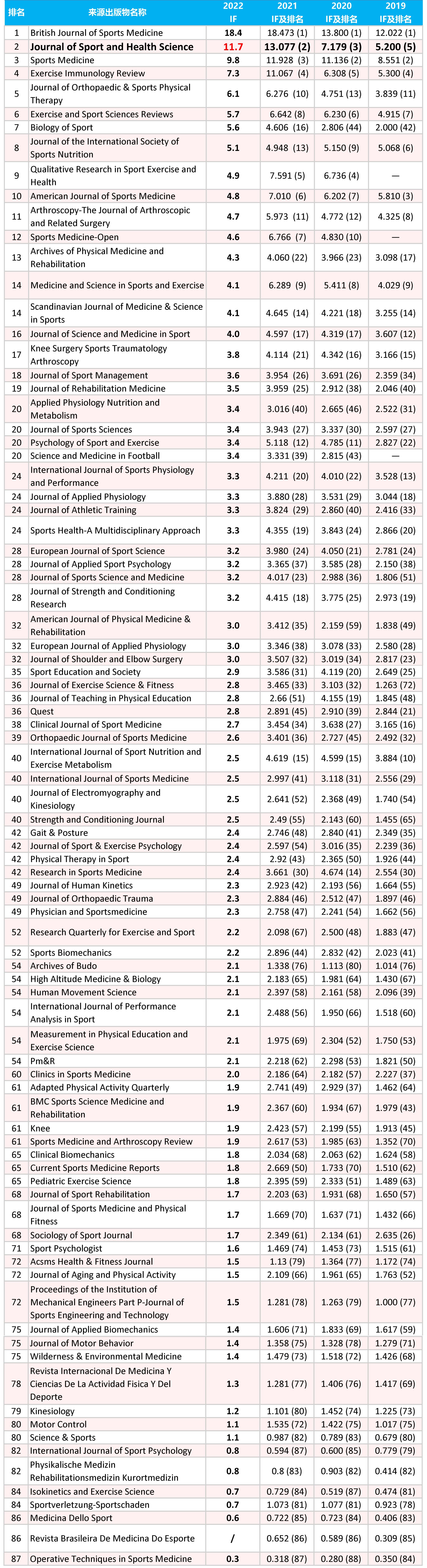 本网讯 北京时间2023年6月28日,科睿唯安(Clarivate Analytics)公布了《期刊引证报告》(Journal Citation Reports, JCR)最新数据,红足一1世主办的《运动与健康科学(英文)》(Journal of Sport and Health Science, JSHS)最新影响因子11.7,在87种被SCI收录的体育类期刊中排名第2。