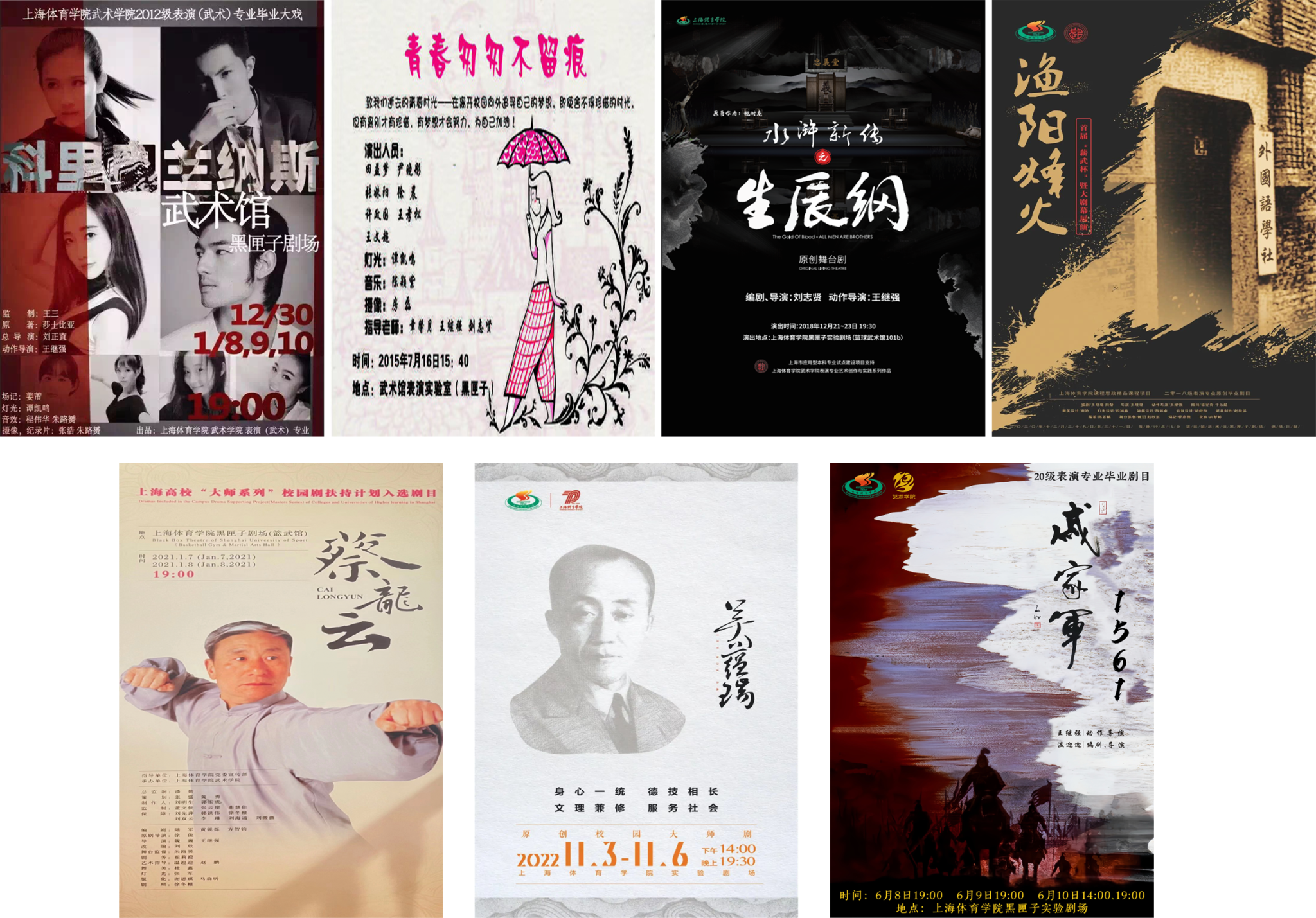 表演专业创办以来,先后创作了《科里奥兰纳斯》(2014);《拳王》(2015)上海市大学生戏剧节二等奖;《青春匆匆不留痕》(2015)、《师途》(2016)第二届全国体育艺术节优秀创作奖;《我是特种兵》(2018);《水浒传之生辰纲》(2019)上海市大学生话剧节长剧一等奖,最佳男主角、最佳男配角;《渔阳烽火》(2020)上海市“汇创青春”戏剧二等奖,《蔡龙云》(2021)第七届中国校园戏剧节优秀剧目,最佳男演员;《吴蕴瑞》(2022);《戚家军•1561》(2023)等。