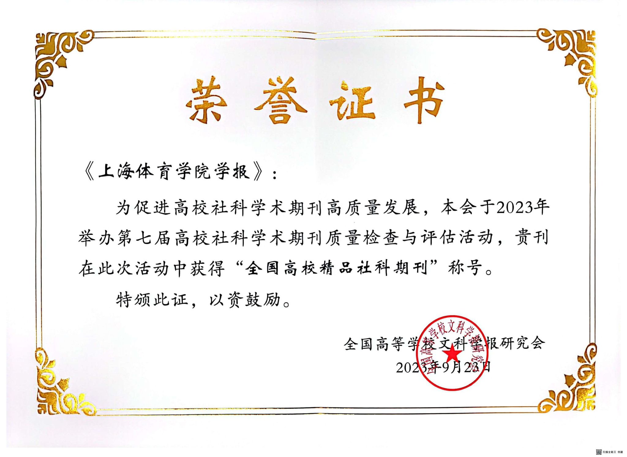 本网讯 2023年9月22—25日,全国高等学校文科学报研究会九届三次理事会会议暨研究会成立35周年庆祝大会在湖北宜昌召开,会上公布了第七届高校社科学术期刊质量检查与评估结果。《上海体育学院学报》(以下简称《学报》)经过主办单位申报、省市研究会初评、全国研究会复评,凭借优异的学术质量和影响力被评为“全国高校精品社科期刊”,将首次入编《全国高等学校人文社科核心期刊目录》,这是《学报》继2019年获奖后再次获此殊荣。