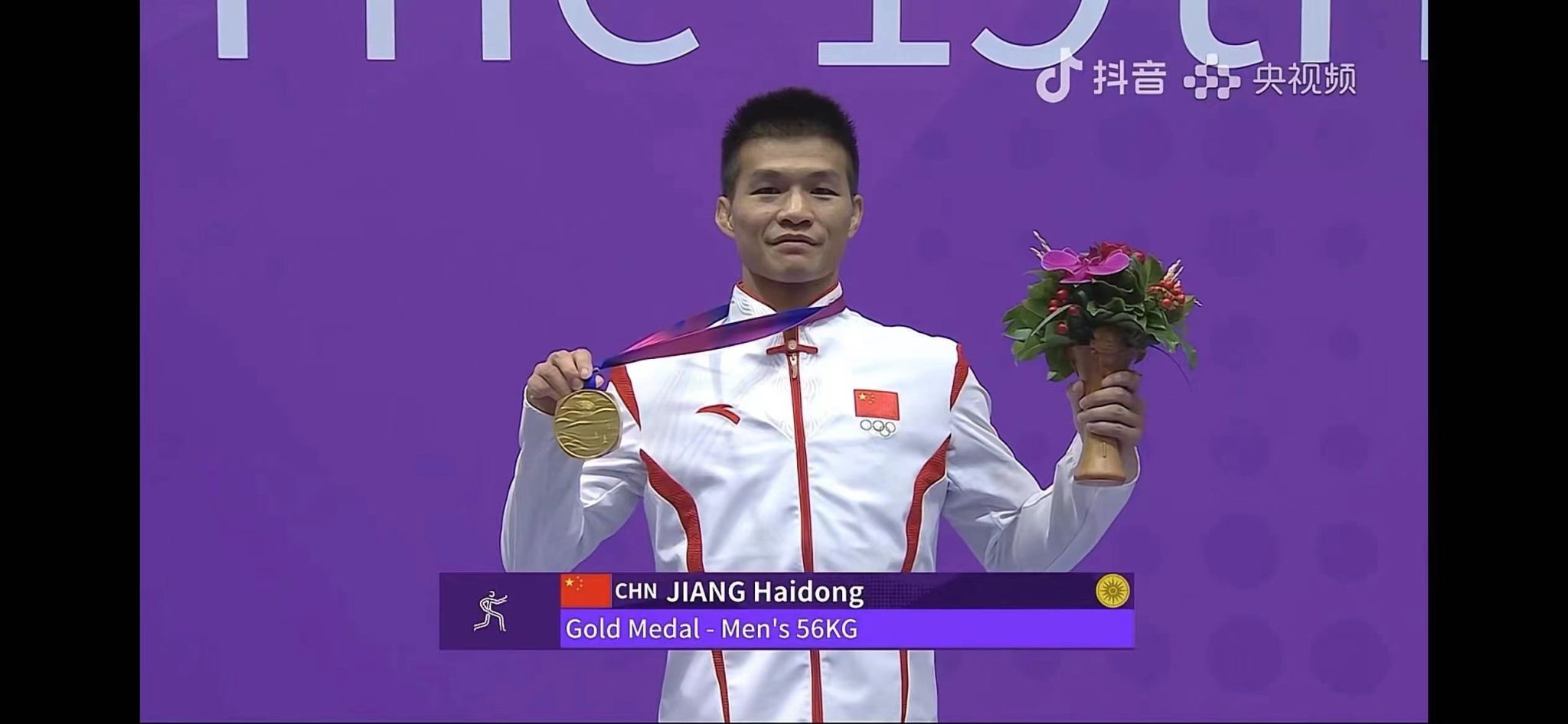 杭州亚运会武术散打比赛开赛后,江海东先后在1/8决赛中,以2∶0战胜哈萨克斯坦选手卡里姆·伊明扎诺夫,取得开门红,强势开启冲冠之旅。在1/4决赛中,他力克印尼选手吉塔拉的挑战,干净利落地赢下比赛,顺利挺进半决赛。在半决赛中,以绝对优势,战胜了越南选手许文团,如愿晋级冠亚军决赛。28日上午,在男子56公斤级决赛上,江海东以压倒性优势战胜来自菲律宾的阿内尔·曼达尔,最终战胜对手,登上最高领奖台,获得金牌!