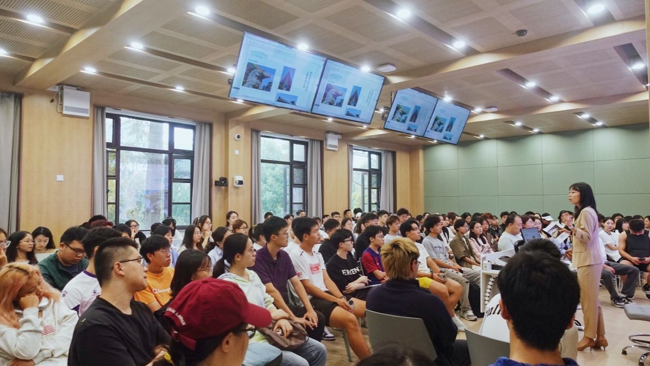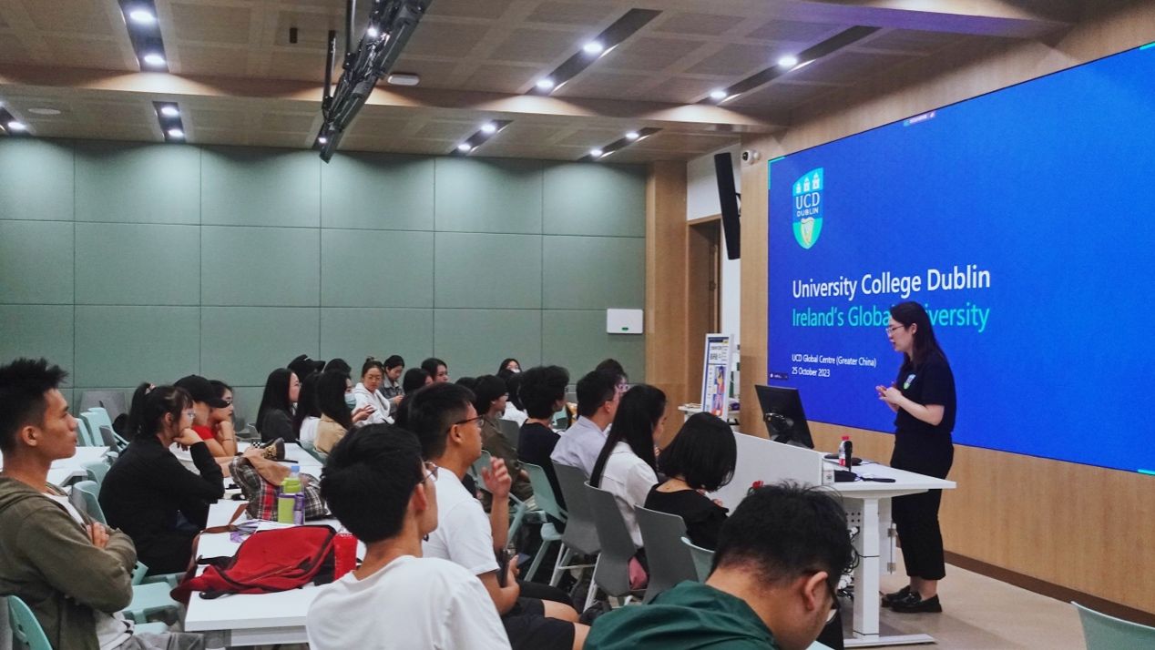 最后,爱尔兰都柏林大学中国办事处的黄洁老师进行专场分享。分享内容涵盖了爱尔兰国家的文化、商业、体育、交通、就业等各个方面的介绍,并特别讲解了上体-都柏林大学本科、本硕、硕士等三大层面的双学位联合培养项目。黄洁老师还解答了同学们关于学制和专业课程安排等疑问。
