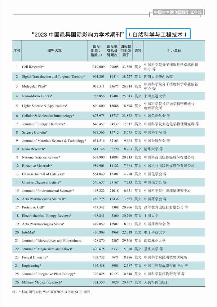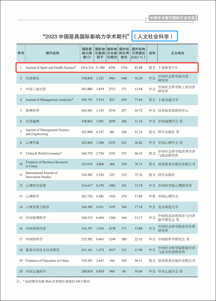 本网讯 日前,中国知网和清华大学图书馆联合发布了《中国学术期刊国际引证年报》(2023版)(以下简称“《年报》”)。《年报》统计了6888种中国学术期刊的国际被引情况,采用的统计源包括国际期刊、会议论文、图书等,其中国际统计源期刊共23572种,通过统计国际期刊对中国期刊的引用,客观反映我国学术期刊在国际学术研究领域的影响力和话语实情。《运动与健康科学(英文)》(Journal of Sport and Health Science, JSHS)连续9年在2536种人文社会科学期刊中排名第一,再获“中国最具国际影响力学术期刊”称号。