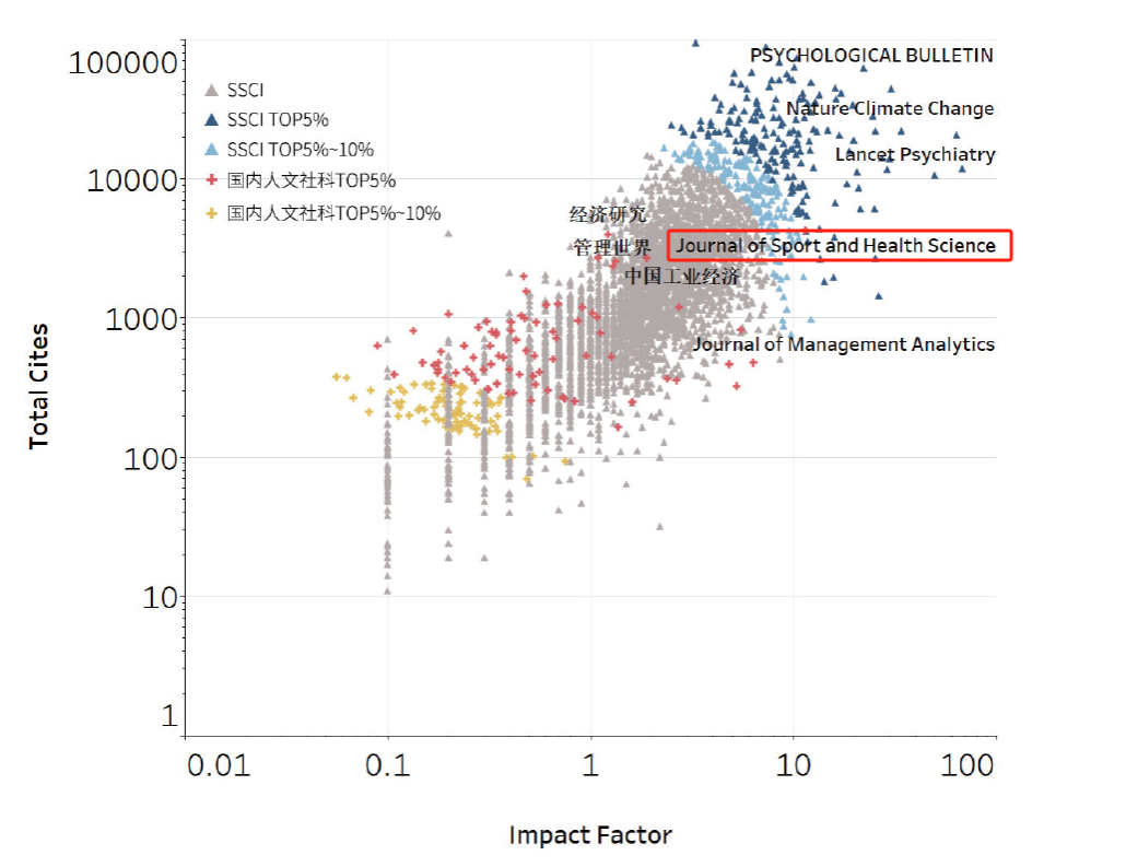 按照惯例,《年报》将遴选出的160本TOP期刊与科睿唯安发布的2023年度《期刊引证报告》(JCR)中的SSCI期刊一起放入“影响因子—总被引频次”双对数坐标系,计算各刊的影响力指数CI并进行对比分析。“Journal of Sport and Health Science已达SSCI期刊TOP水平,整体表现要优于去年,稳步迈进国际一流期刊行列”(摘自《年报》原文)。