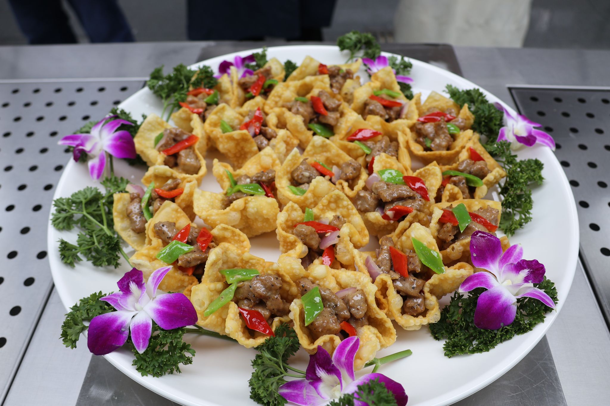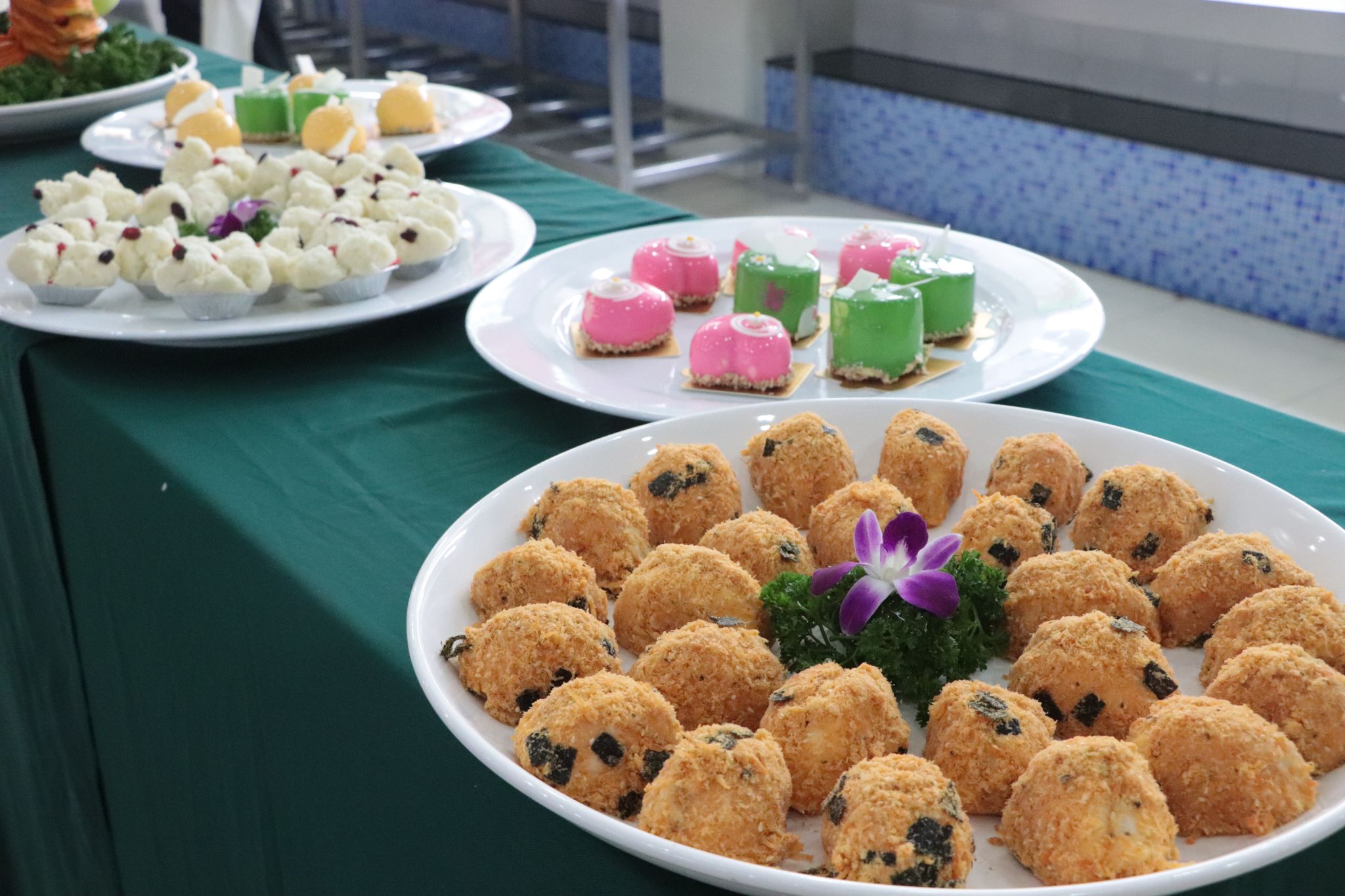 烹饪菜肴以创意自选菜进行比拼,选手们纷纷亮出自己的绝活,在操作台前有条不紊,菊花鱼、芥末虾球、石榴牛肉盏、卡夫酱脆皮虾仁、五彩豆腐丁等13道精美菜品陆续展现在师生的面前,菜肴的色、香、味、形俱佳,众人赞不绝口。