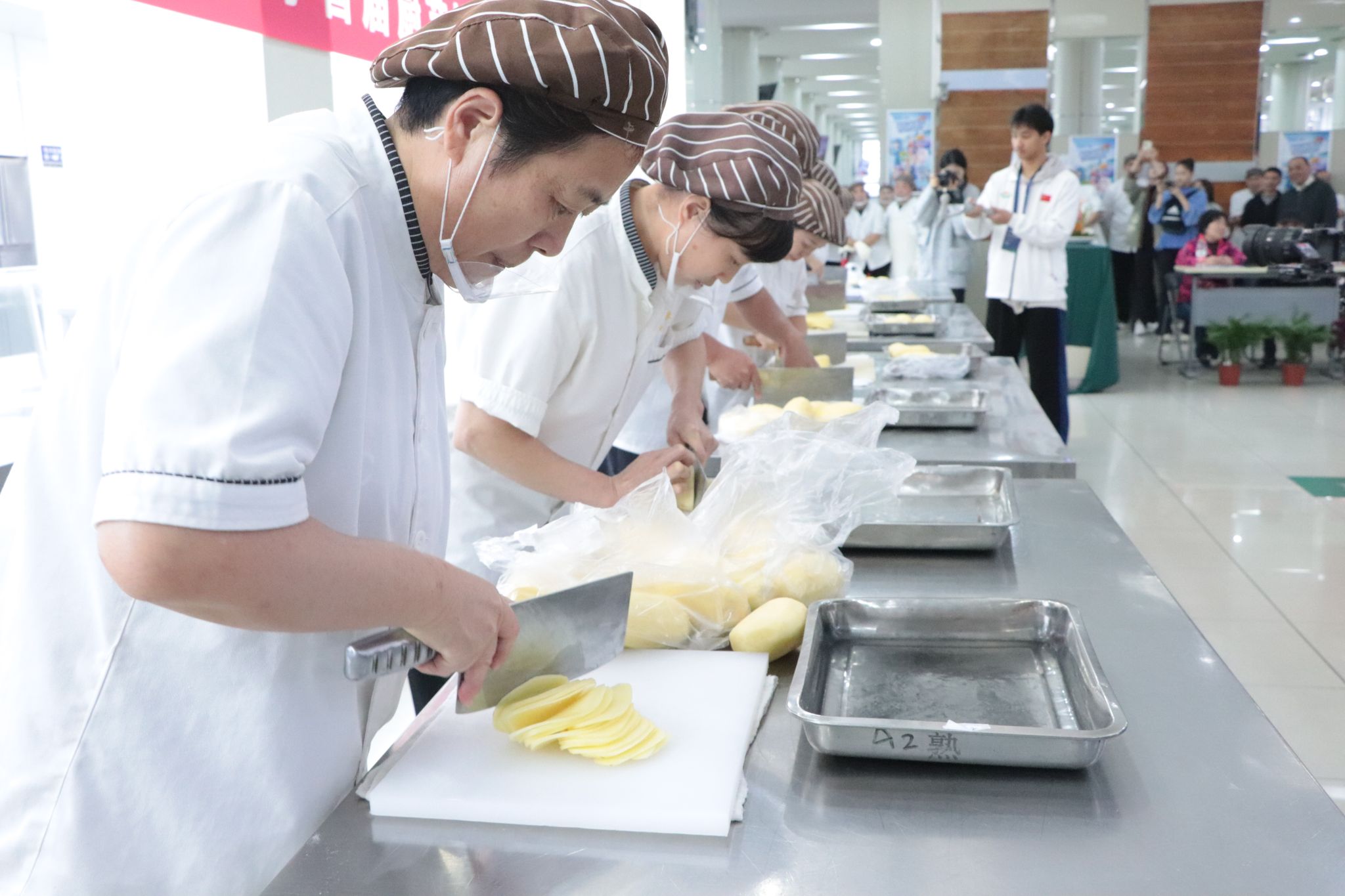 比赛共分为切大排、包香菇菜包、切土豆丝、包白菜大肉水饺和烹饪菜肴五个单项进行比拼。比赛设裁判长一名,活动评委由组委会聘请专业教师、学生代表共同参与。参赛选手赛前进行抽签,按抽签顺序参赛。比赛过程中,选手们严格遵循比赛规程和操作规范,同台竞技、争分夺秒、全身心投入。香菇菜包、白菜大肉水饺,各个形态饱满匀称、表皮光滑、皱褶均匀。土豆丝根根粗细均匀,大排大小、厚薄匀称,与比赛限定克数几乎毫厘不差,充分展现了选手们娴熟的刀工。