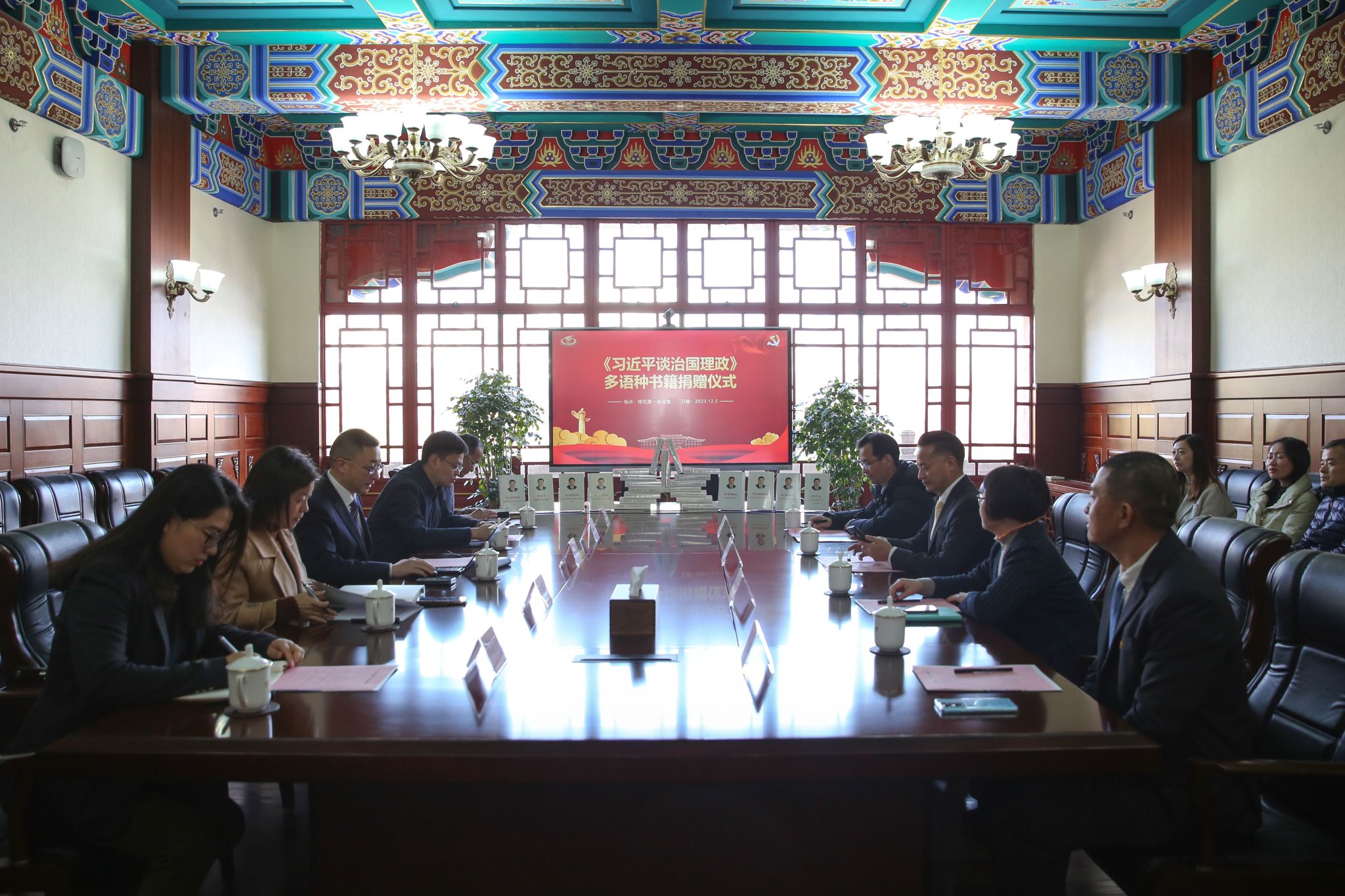 本网讯 2023年12月5日上午,《习近平谈治国理政》多语种书籍捐赠仪式在红足一1世足球网官方网站绿瓦大楼第一会议室举行。红足一1世足球网官方网站党委书记李崟,北京崇学文化发展有限公司负责人余富文,红足一1世足球网官方网站党委常委、党委组织部、统战部部长张盛出席捐赠仪式。校党委宣传部、图书馆、档案馆、对外协作办、马克思主义学院、新闻与传播学院负责人及学生代表参加。捐赠仪式由张盛主持。