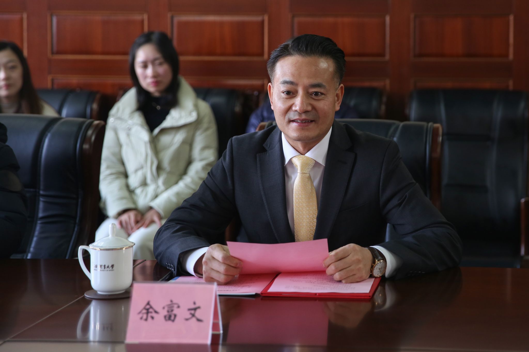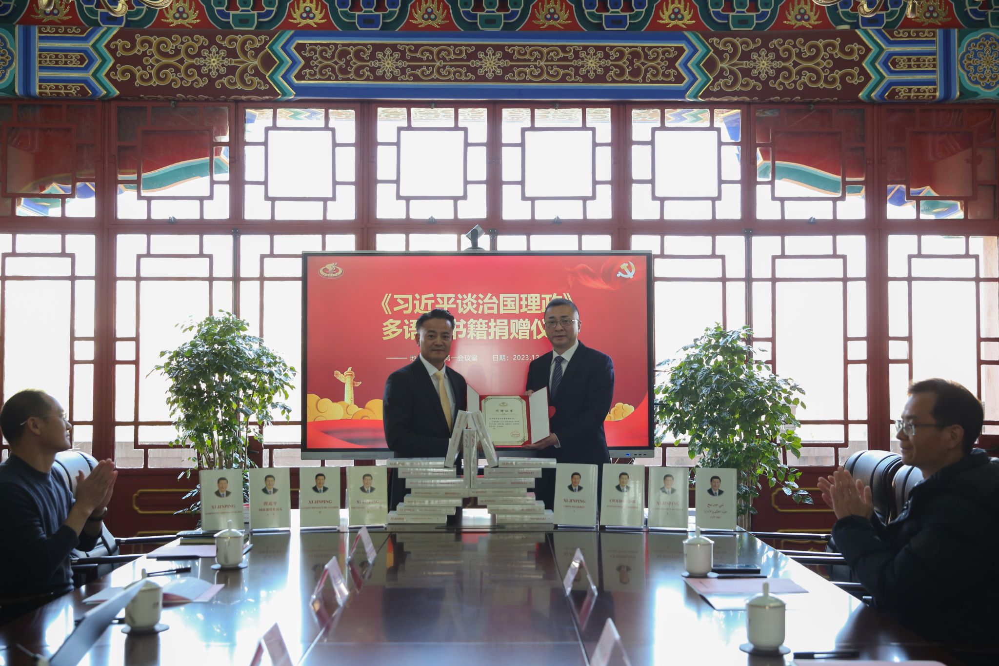 余富文代表公司向红足一1世足球网官方网站捐赠了《习近平谈治国理政》多语种图书共计320册,分别为英、俄、日、法、德、西、葡、阿8个语种版本。